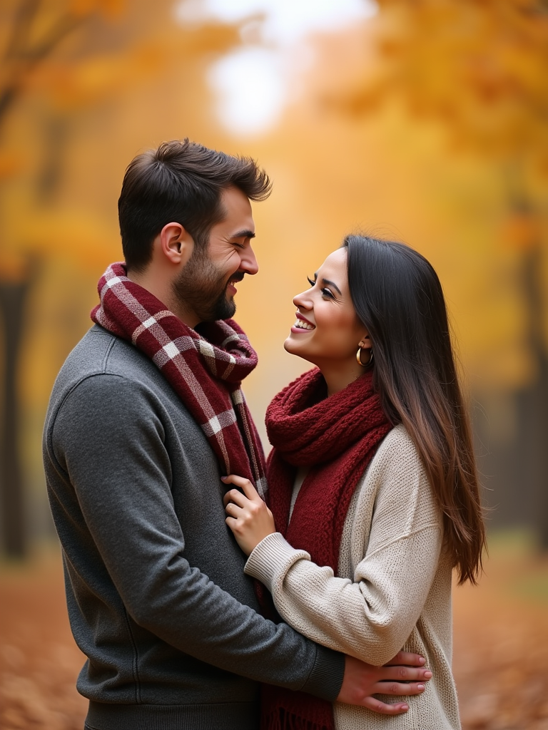 Autumn engagement photoshoot with cozy outfits. Wearing a stylish knit sweater and scarf . Warm golden leaves in the background, soft bokeh effect.