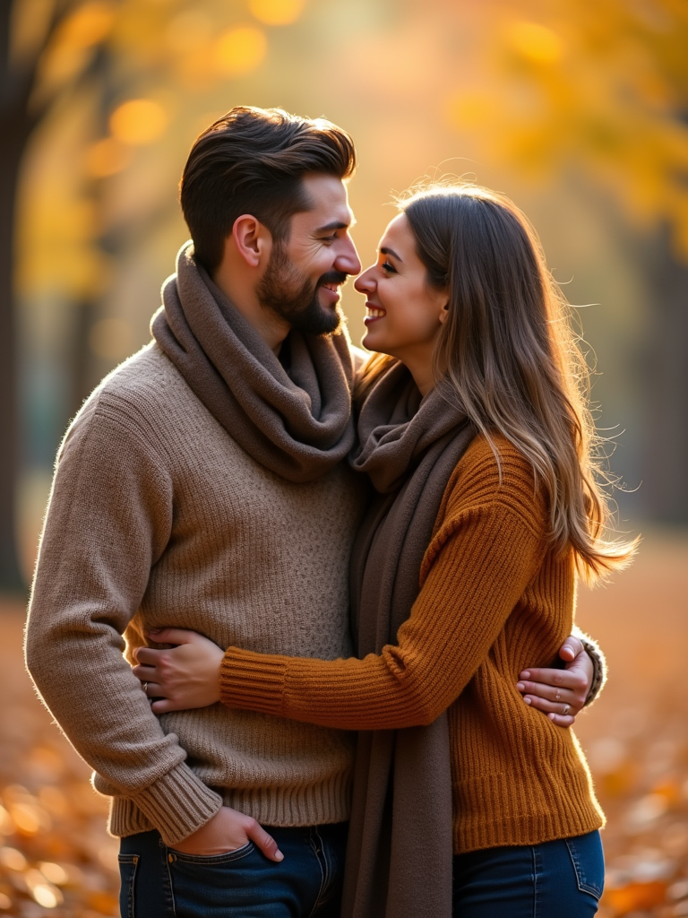 Autumn engagement photoshoot with cozy outfits. Wearing a stylish knit sweater and scarf . Warm golden leaves in the background, soft bokeh effect.