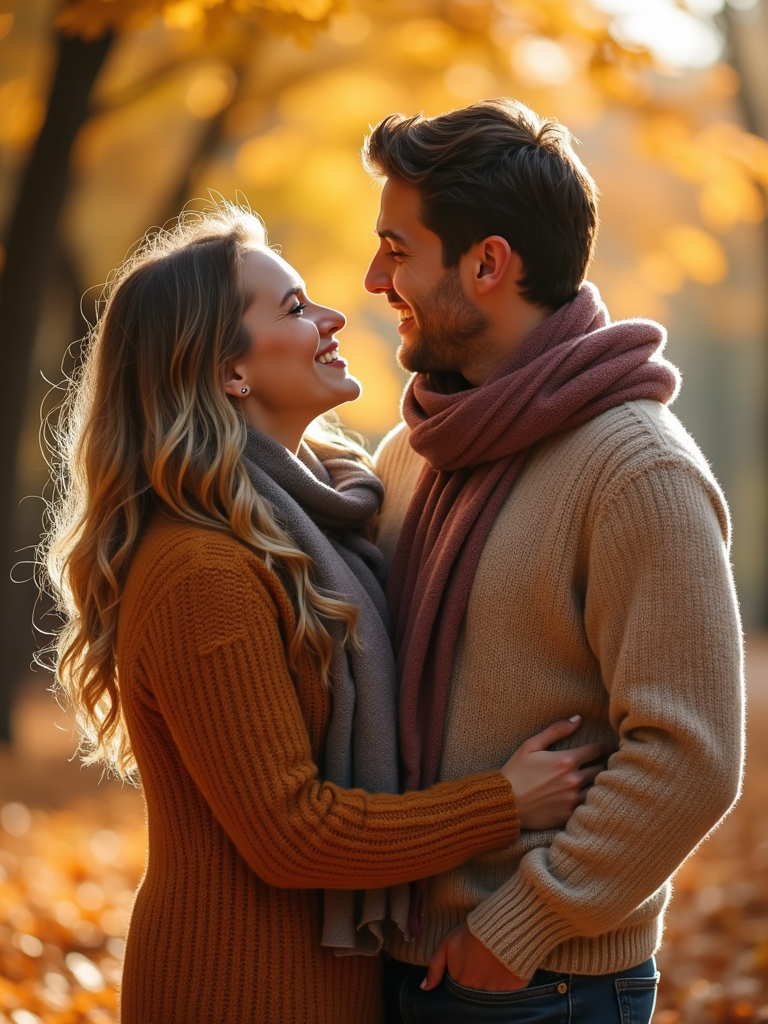 Autumn engagement photoshoot with cozy outfits. Wearing a stylish knit sweater and scarf . Warm golden leaves in the background, soft bokeh effect.