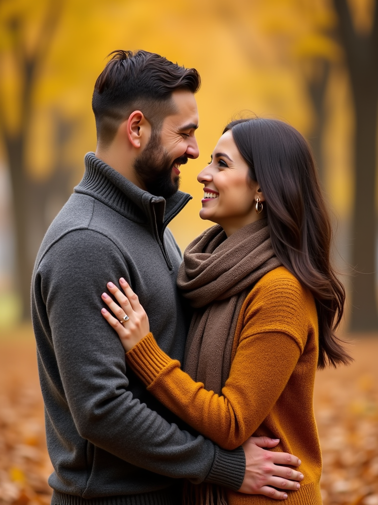 Autumn engagement photoshoot with cozy outfits. Wearing a stylish knit sweater and scarf . Warm golden leaves in the background, soft bokeh effect.