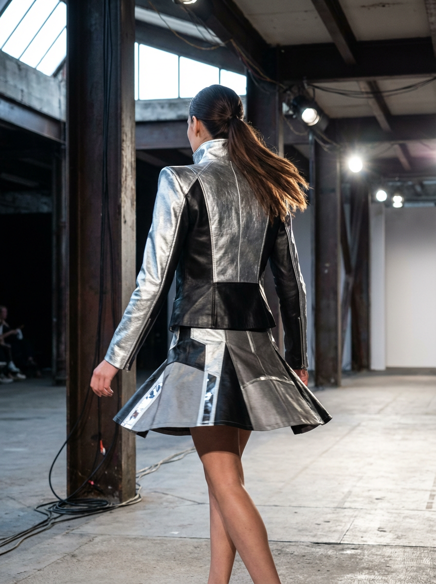 back view of model walking on a fashion runway in an industrial space, captured mid-twirl, showcasing a futuristic outfit with sharp lines