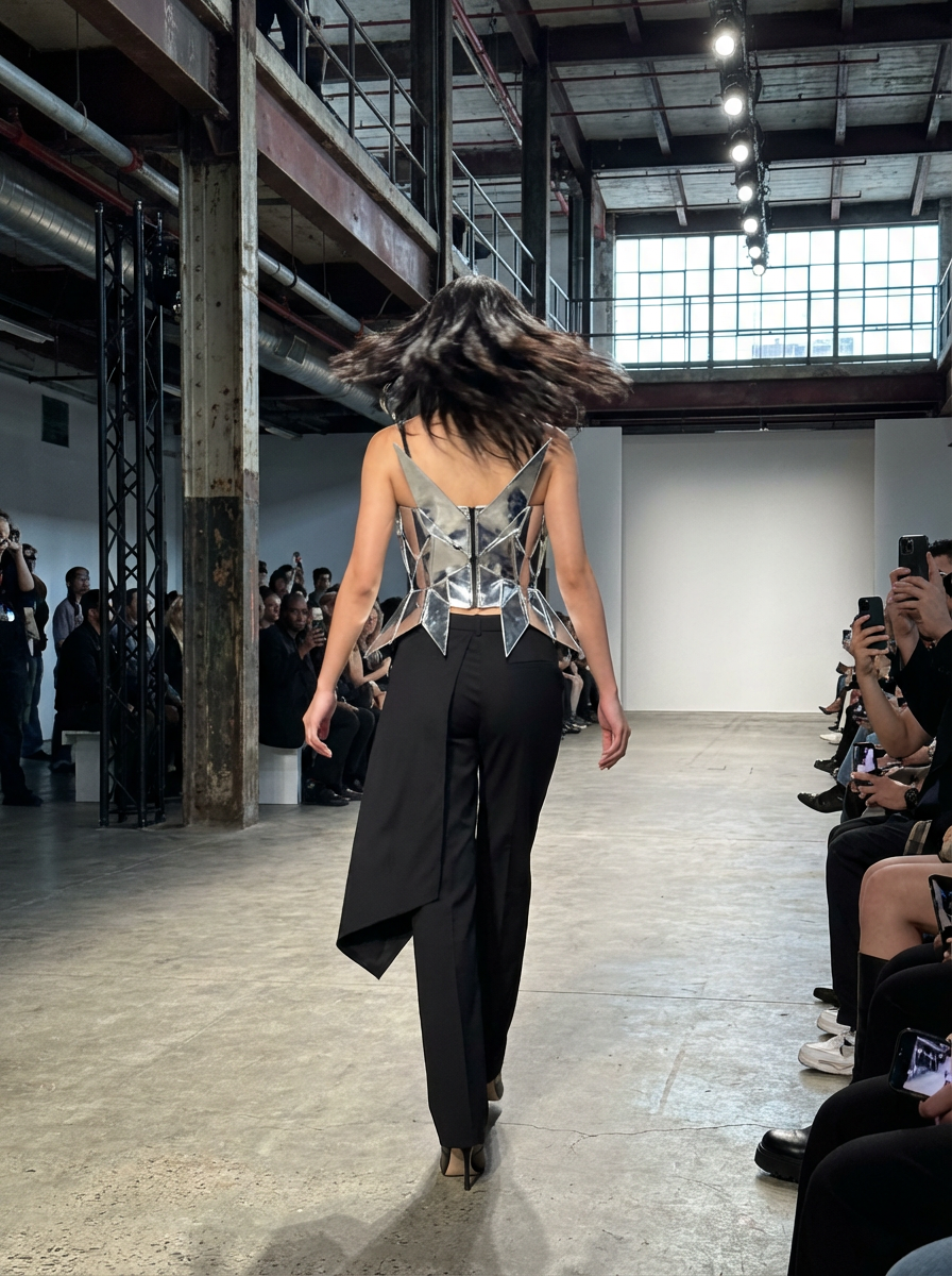 back view of model walking on a fashion runway in an industrial space, captured mid-twirl, showcasing a futuristic outfit with sharp lines
