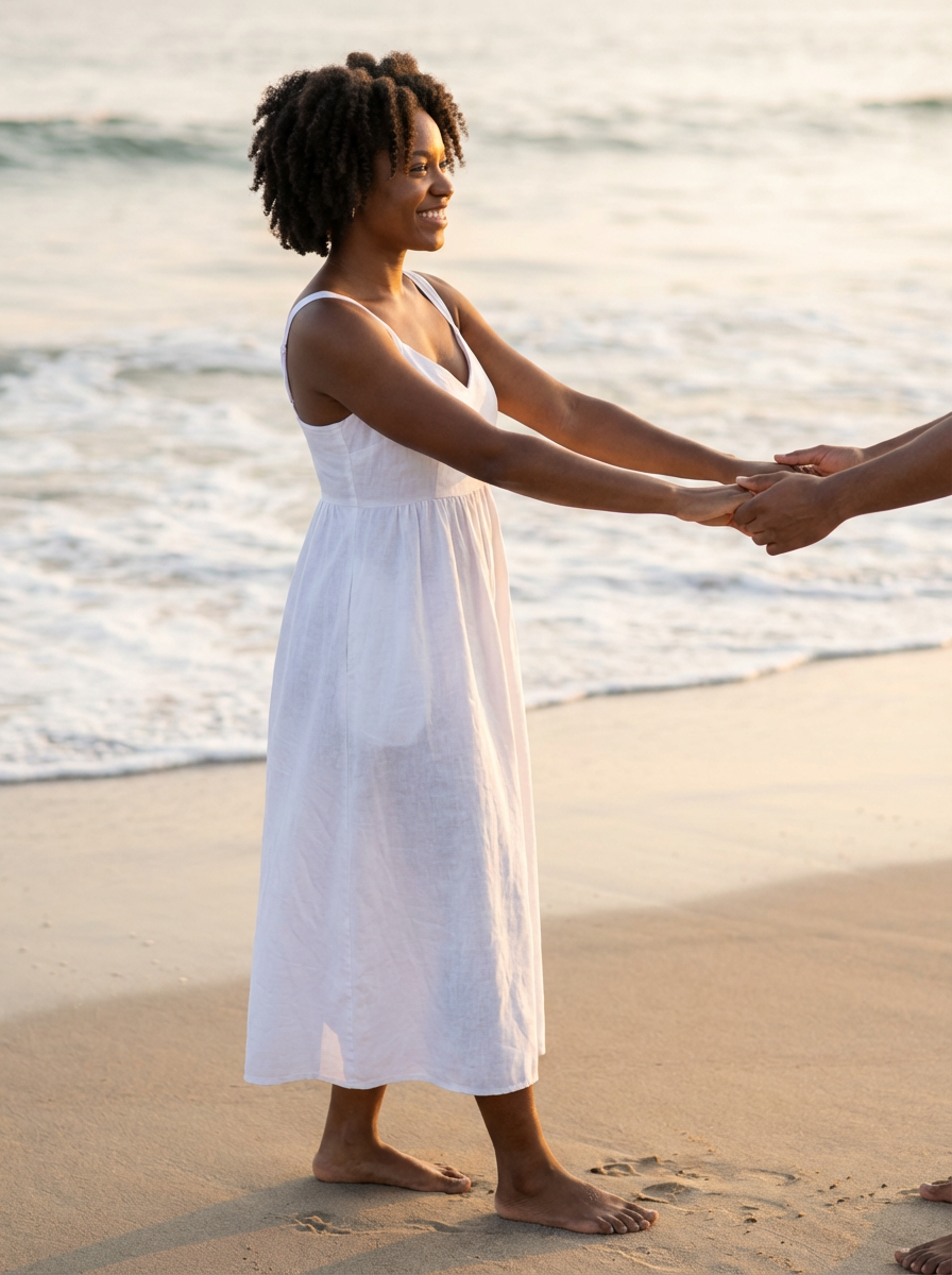 Beachside engagement photoshoot, natural and relaxed. Model wearing a breezy sundress, barefoot on the sand . Holding hands by the water, soft waves in the background.