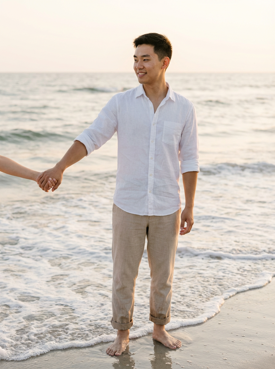 Beachside engagement photoshoot, natural and relaxed. Model wearing rolled-up linen pants and a white button-up shirt . Holding hands by the water, soft waves in the background.