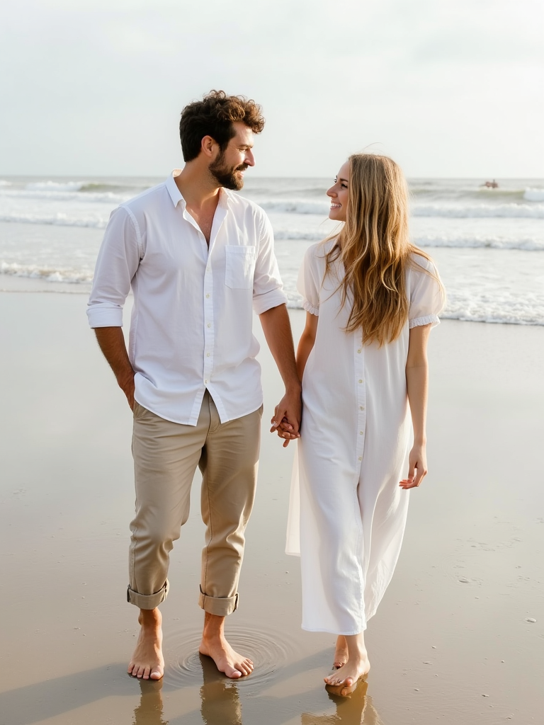 Beachside engagement photoshoot, natural and relaxed. Wearing rolled-up linen pants and a white button-up shirt . Holding hands by the water, soft waves in the background.