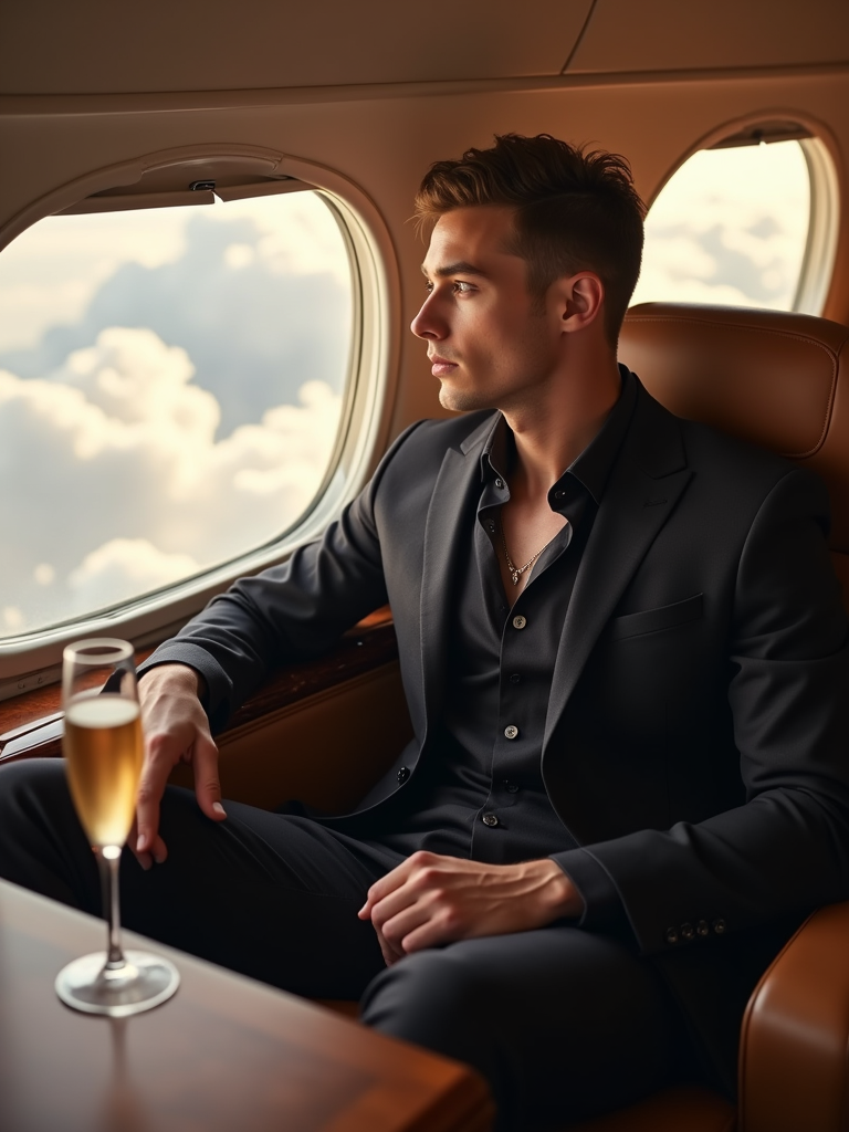 beautiful influencer instagram model wearing elegant clothes sitting in private jet cabin, with leather interior, luxurious. champagne is on the table. outside is clouds because we are flying.