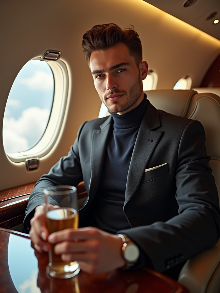 beautiful influencer instagram model wearing elegant clothes sitting in private jet cabin, with leather interior, luxurious. champagne is on the table. outside is clouds because we are flying.