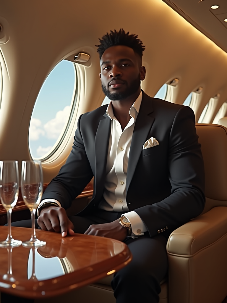 beautiful influencer instagram model wearing elegant clothes sitting in private jet cabin, with leather interior, luxurious. champagne is on the table. outside is clouds because we are flying.