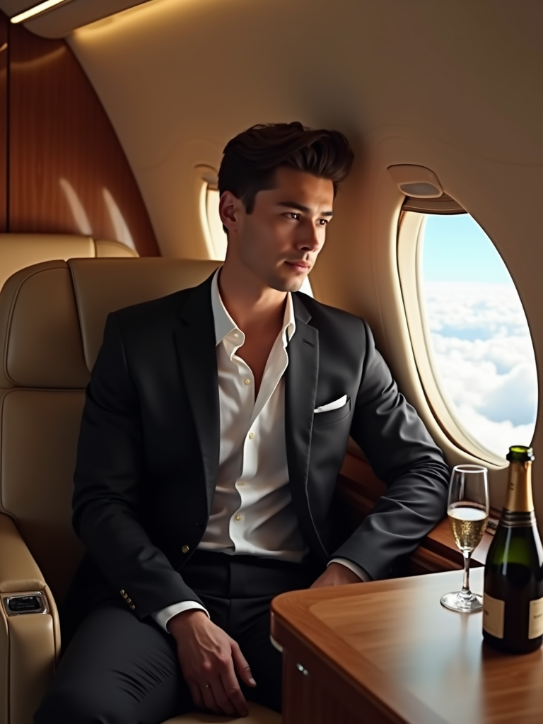 beautiful influencer instagram model wearing elegant clothes sitting in private jet cabin, with leather interior, luxurious. champagne is on the table. outside is clouds because we are flying.