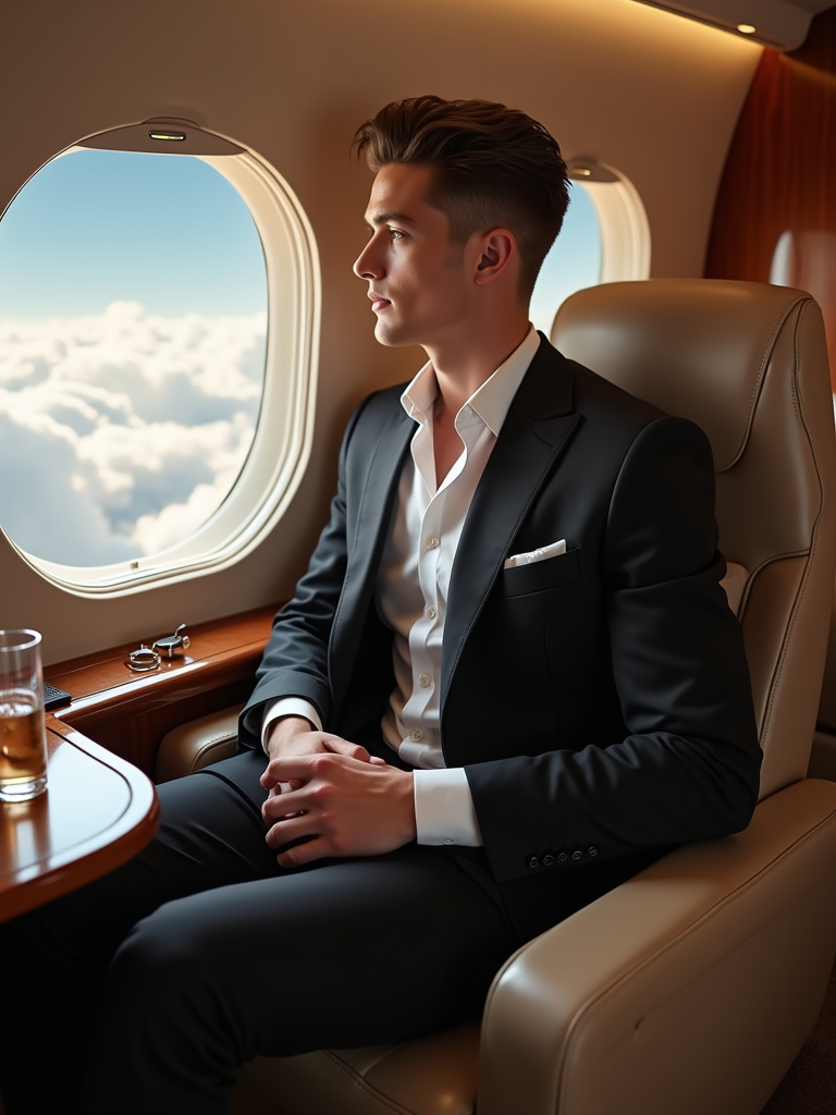 beautiful influencer instagram model wearing elegant clothes sitting in private jet cabin, with leather interior, luxurious. champagne is on the table. outside is clouds because we are flying.