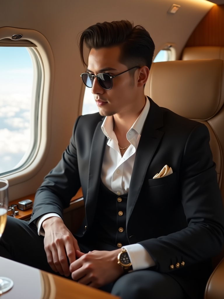 beautiful influencer instagram model wearing elegant clothes sitting in private jet cabin, with leather interior, luxurious. champagne is on the table. outside is clouds because we are flying.