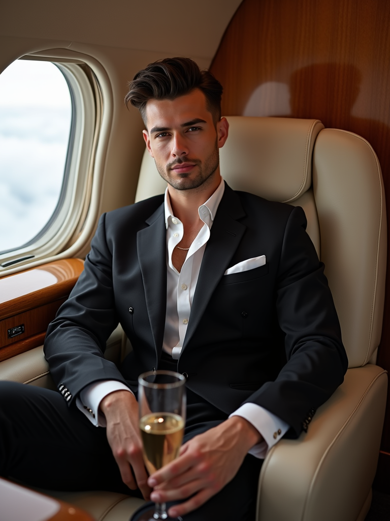 beautiful influencer instagram model wearing elegant clothes sitting in private jet cabin, with leather interior, luxurious. champagne is on the table. outside is clouds because we are flying.