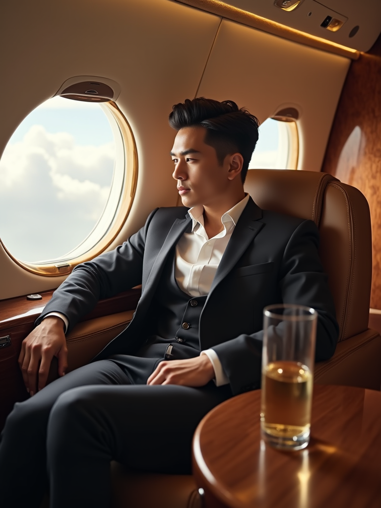 beautiful influencer instagram model wearing elegant clothes sitting in private jet cabin, with leather interior, luxurious. champagne is on the table. outside is clouds because we are flying.