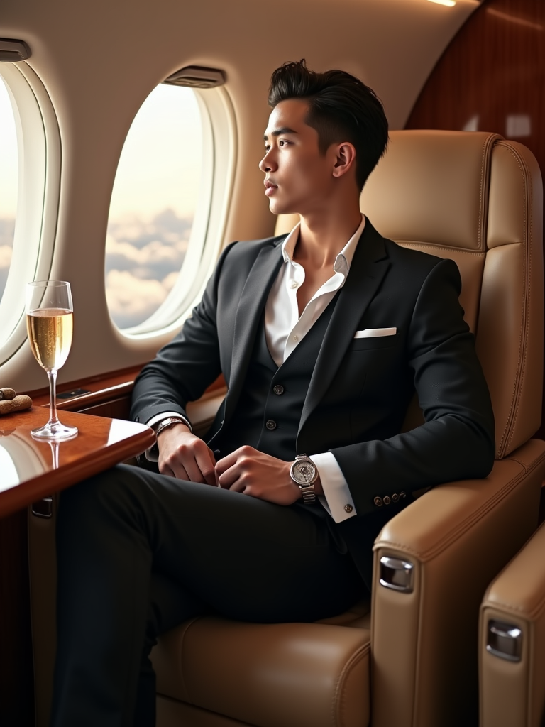 beautiful influencer instagram model wearing elegant clothes sitting in private jet cabin, with leather interior, luxurious. champagne is on the table. outside is clouds because we are flying.