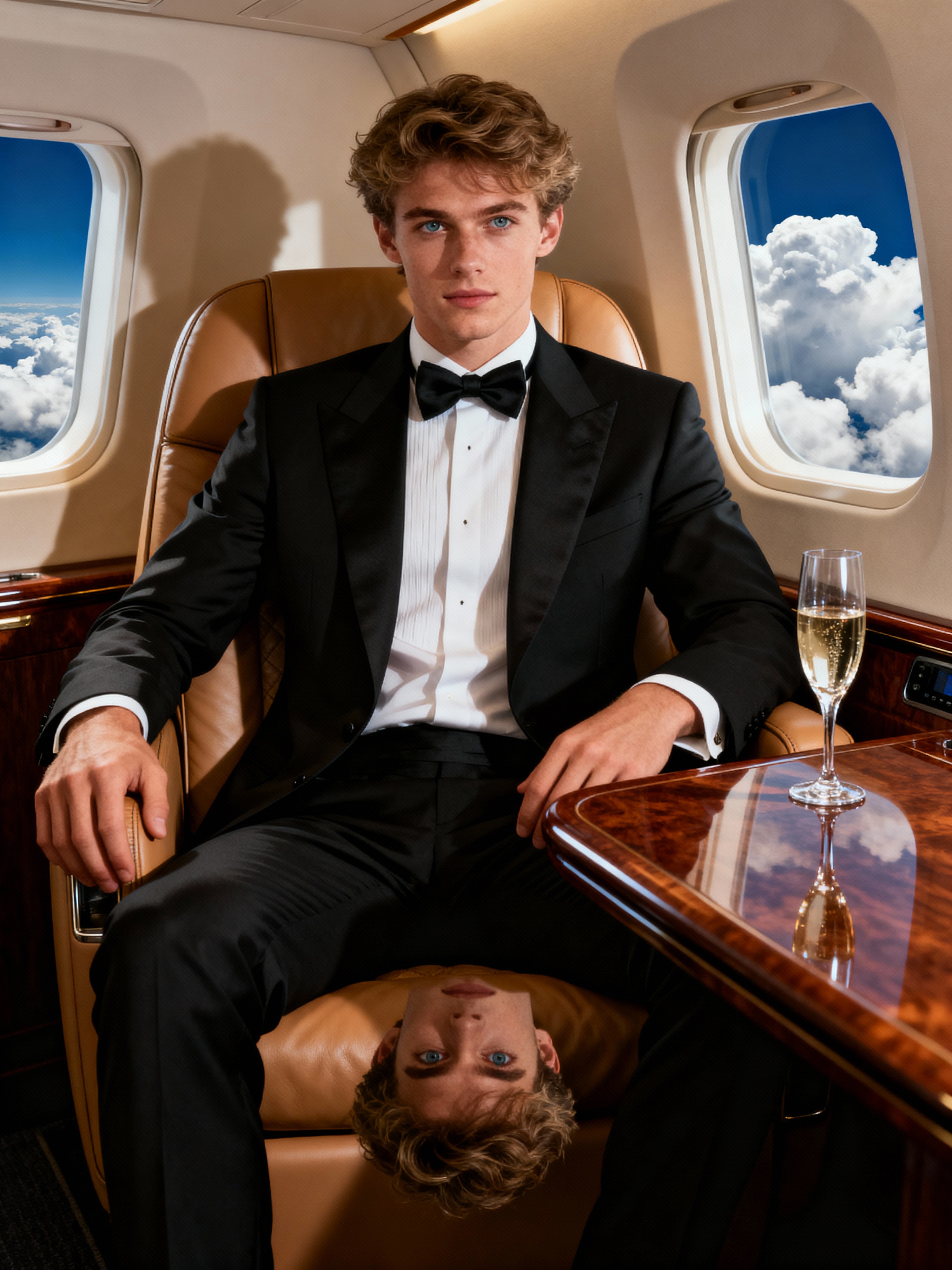beautiful influencer instagram model wearing elegant clothes sitting in private jet cabin, with leather interior, luxurious. champagne is on the table. outside is clouds because we are flying.