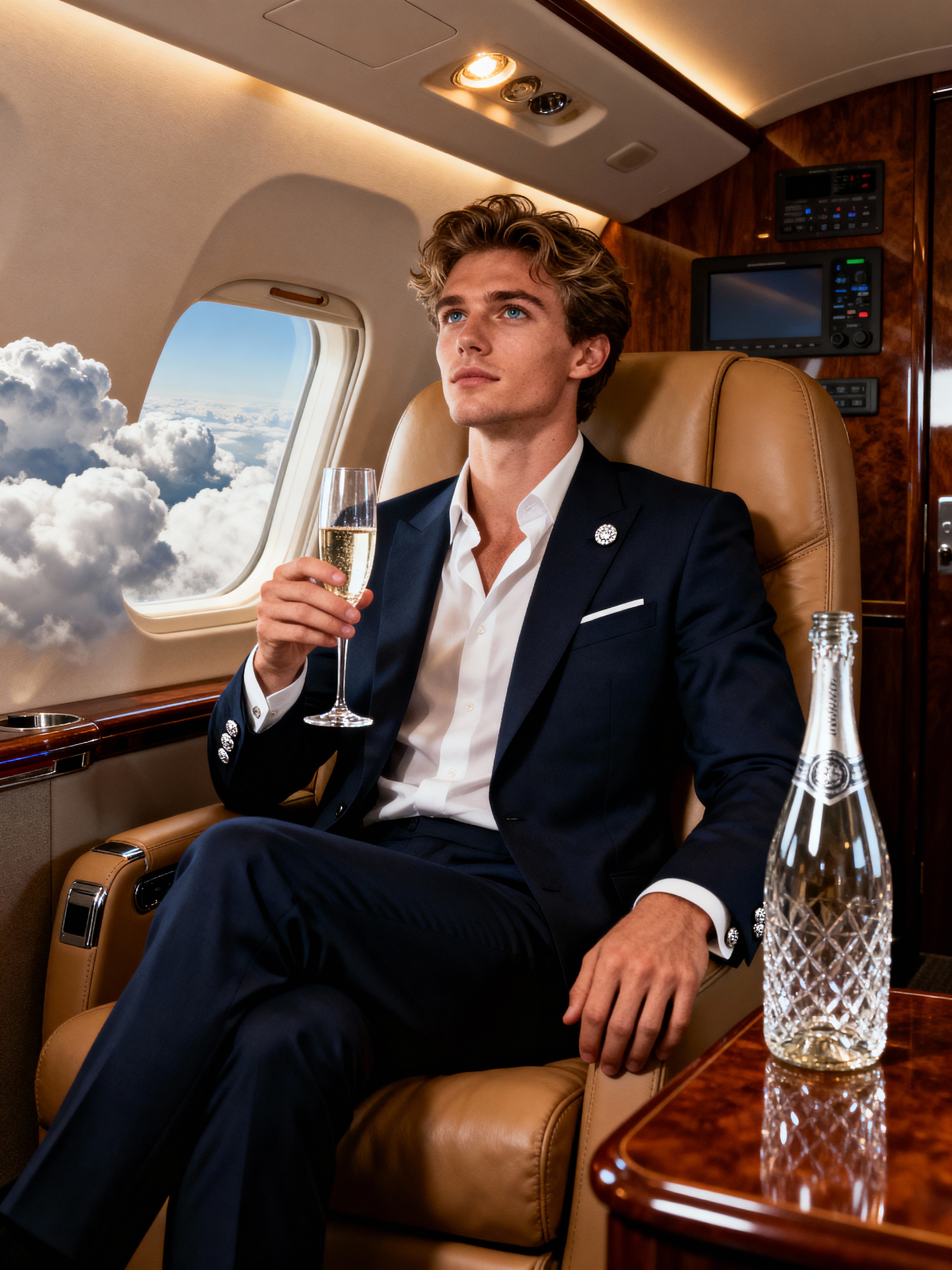 beautiful influencer instagram model wearing elegant clothes sitting in private jet cabin, with leather interior, luxurious. champagne is on the table. outside is clouds because we are flying.