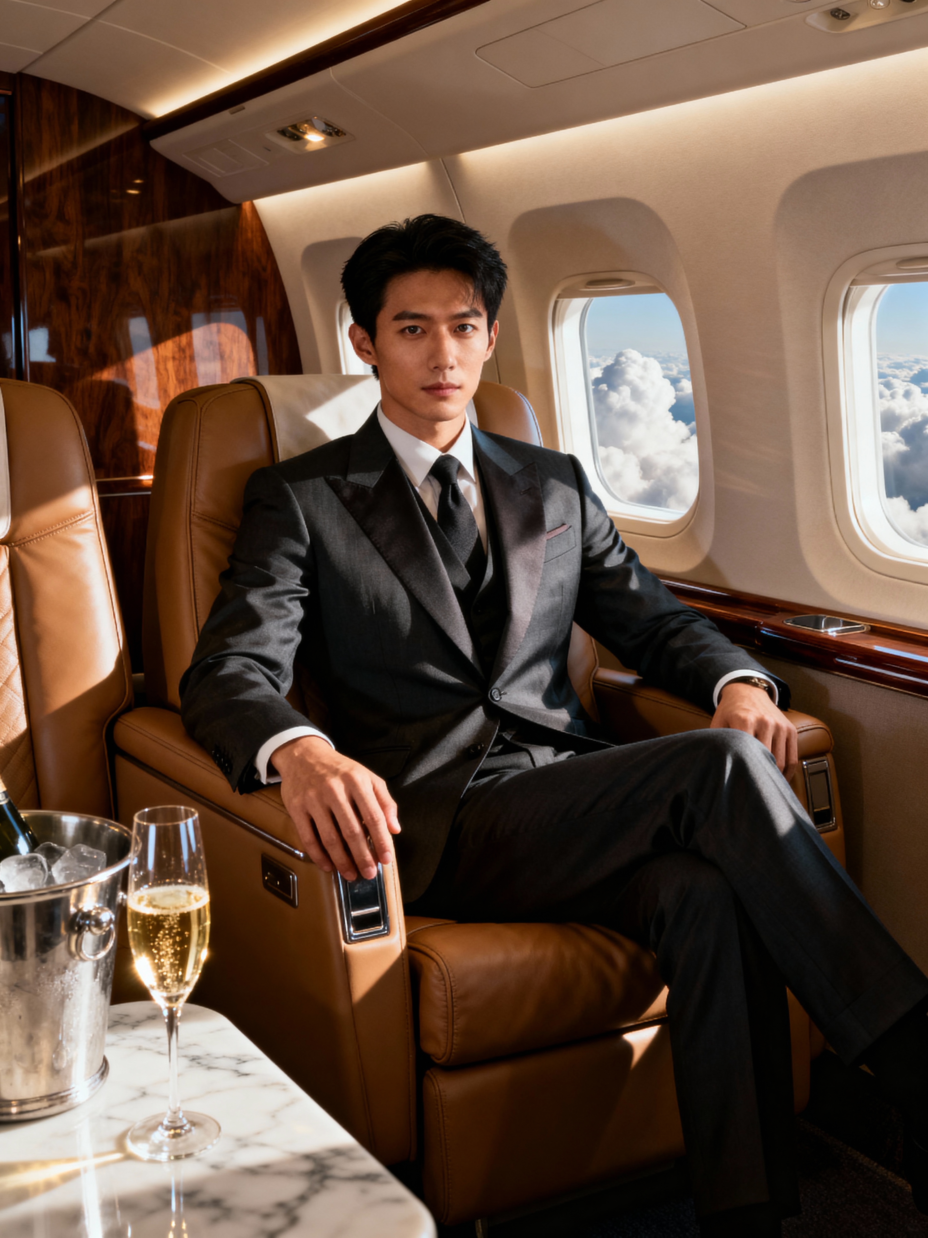 beautiful influencer instagram model wearing elegant clothes sitting in private jet cabin, with leather interior, luxurious. champagne is on the table. outside is clouds because we are flying.