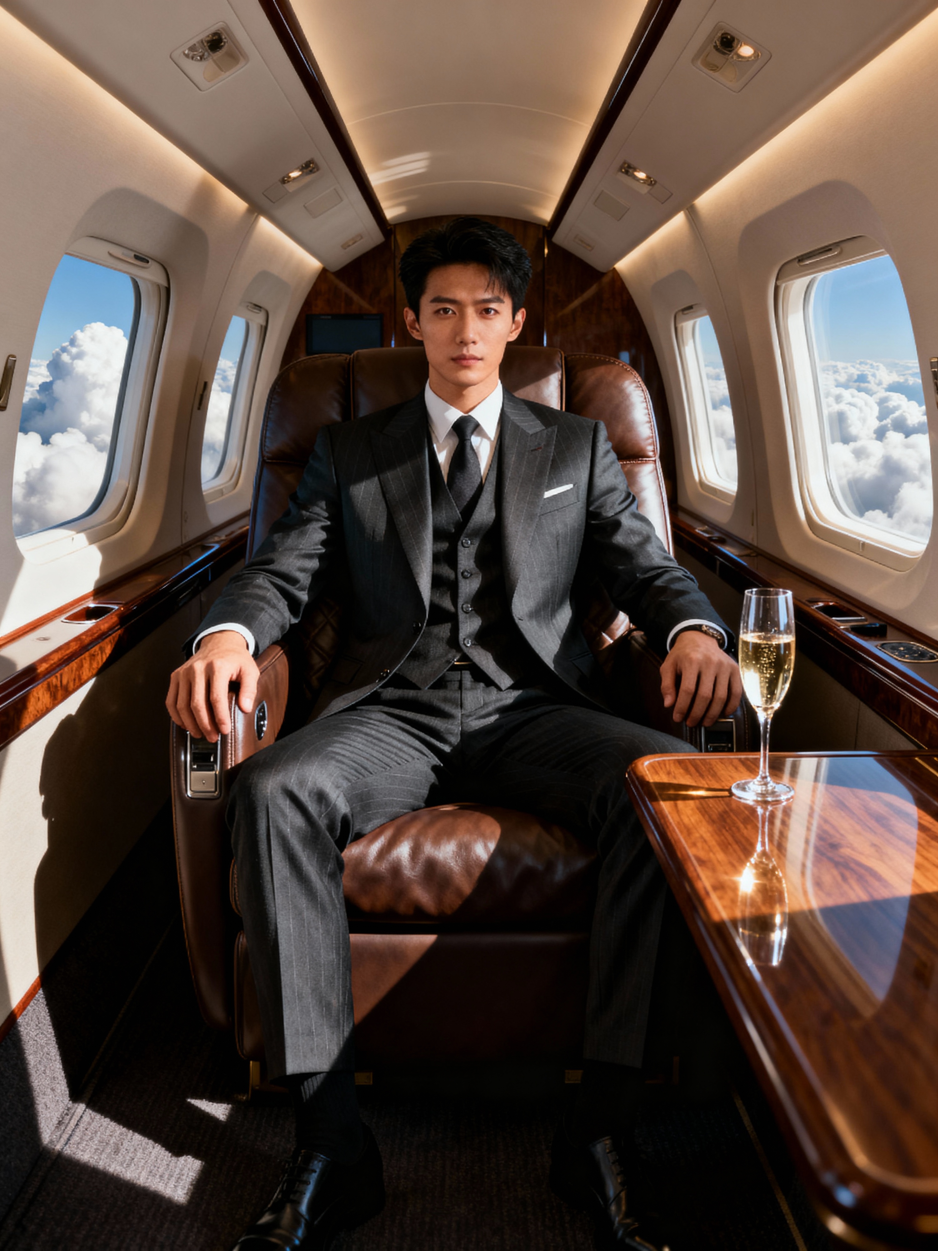 beautiful influencer instagram model wearing elegant clothes sitting in private jet cabin, with leather interior, luxurious. champagne is on the table. outside is clouds because we are flying.