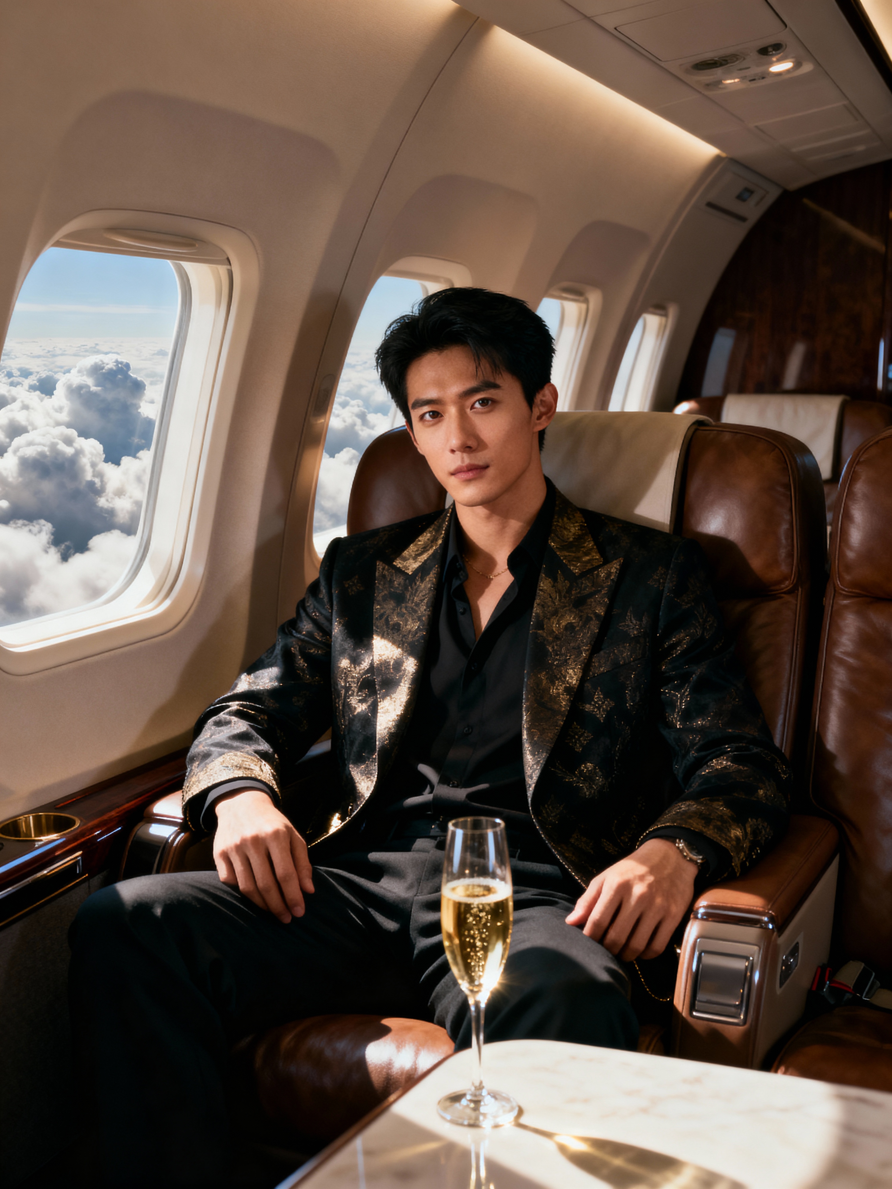 beautiful influencer instagram model wearing elegant clothes sitting in private jet cabin, with leather interior, luxurious. champagne is on the table. outside is clouds because we are flying.
