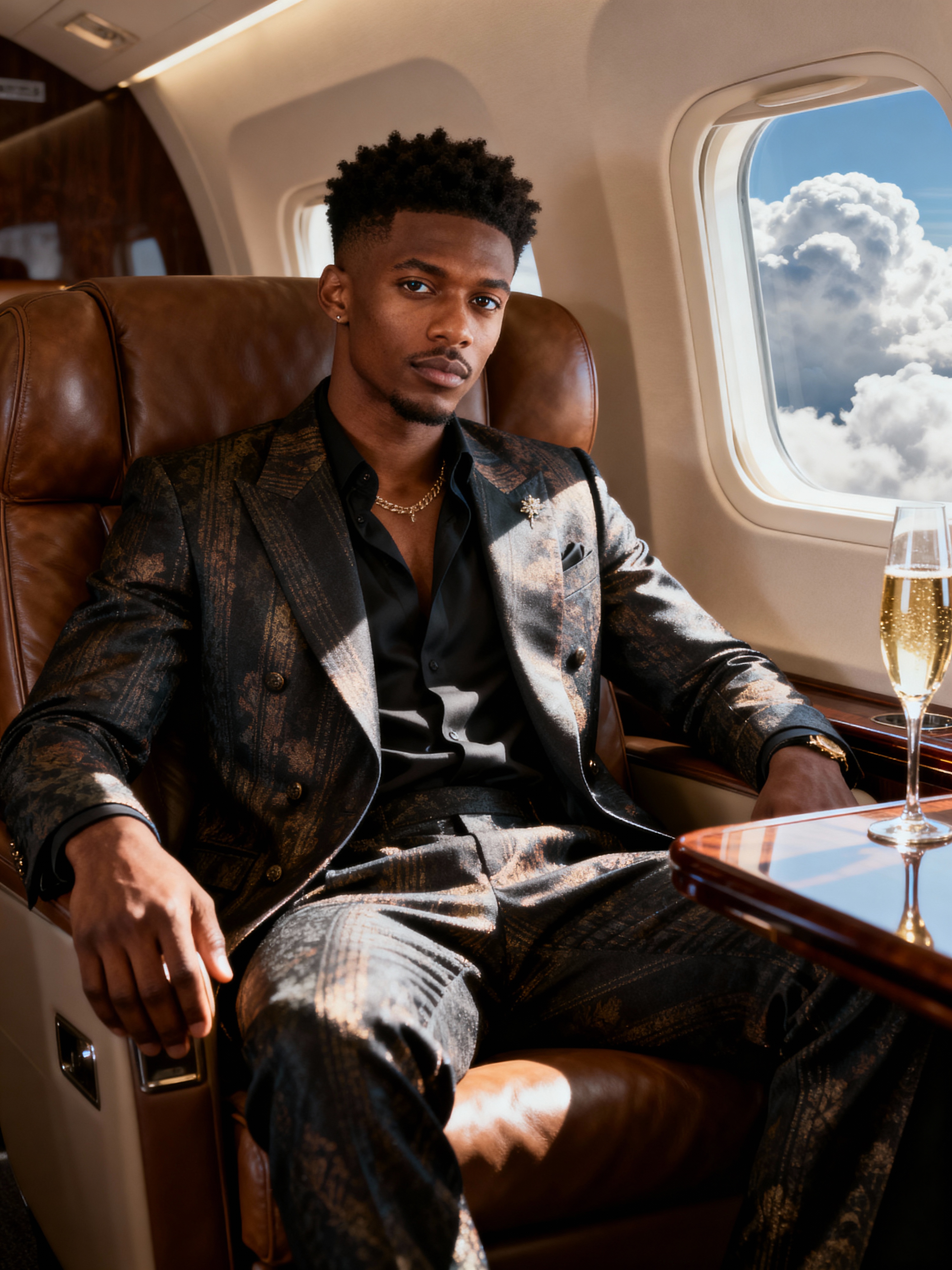 beautiful influencer instagram model wearing elegant clothes sitting in private jet cabin, with leather interior, luxurious. champagne is on the table. outside is clouds because we are flying.