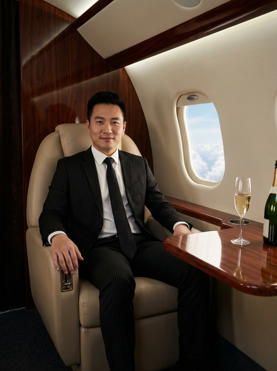 beautiful influencer instagram model wearing elegant clothes sitting in private jet cabin, with leather interior, luxurious. champagne is on the table. outside is clouds because we are flying.