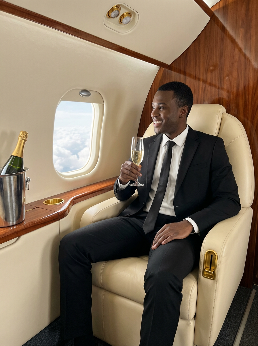 beautiful influencer instagram model wearing elegant clothes sitting in private jet cabin, with leather interior, luxurious. champagne is on the table. outside is clouds because we are flying.
