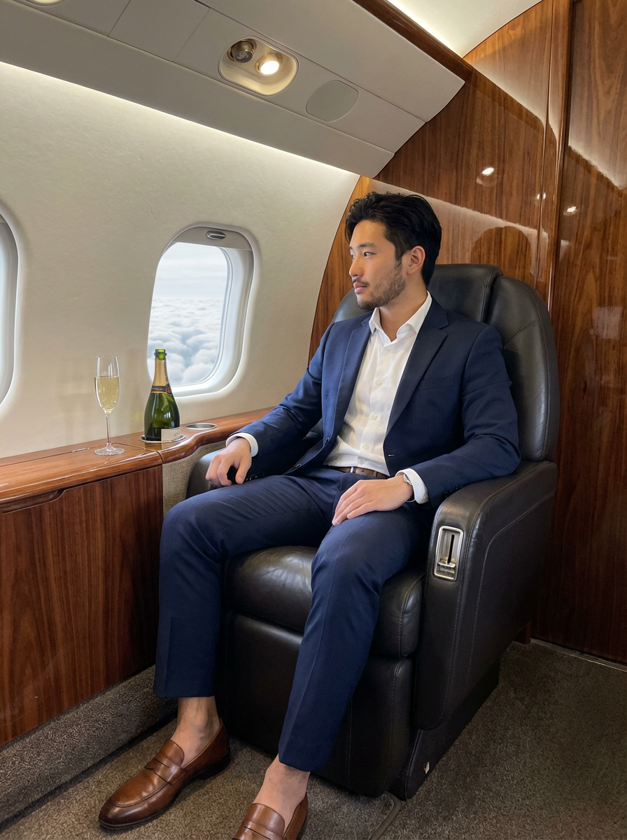 beautiful influencer instagram model wearing elegant clothes sitting in private jet cabin, with leather interior, luxurious. champagne is on the table. outside is clouds because we are flying.