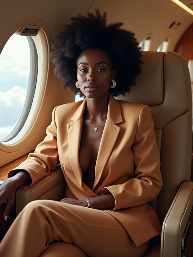 beautiful influencer instagram model wearing elegant clothes sitting in private jet cabin, with leather interior, luxurious. champagne is on the table. outside is clouds because we are flying.