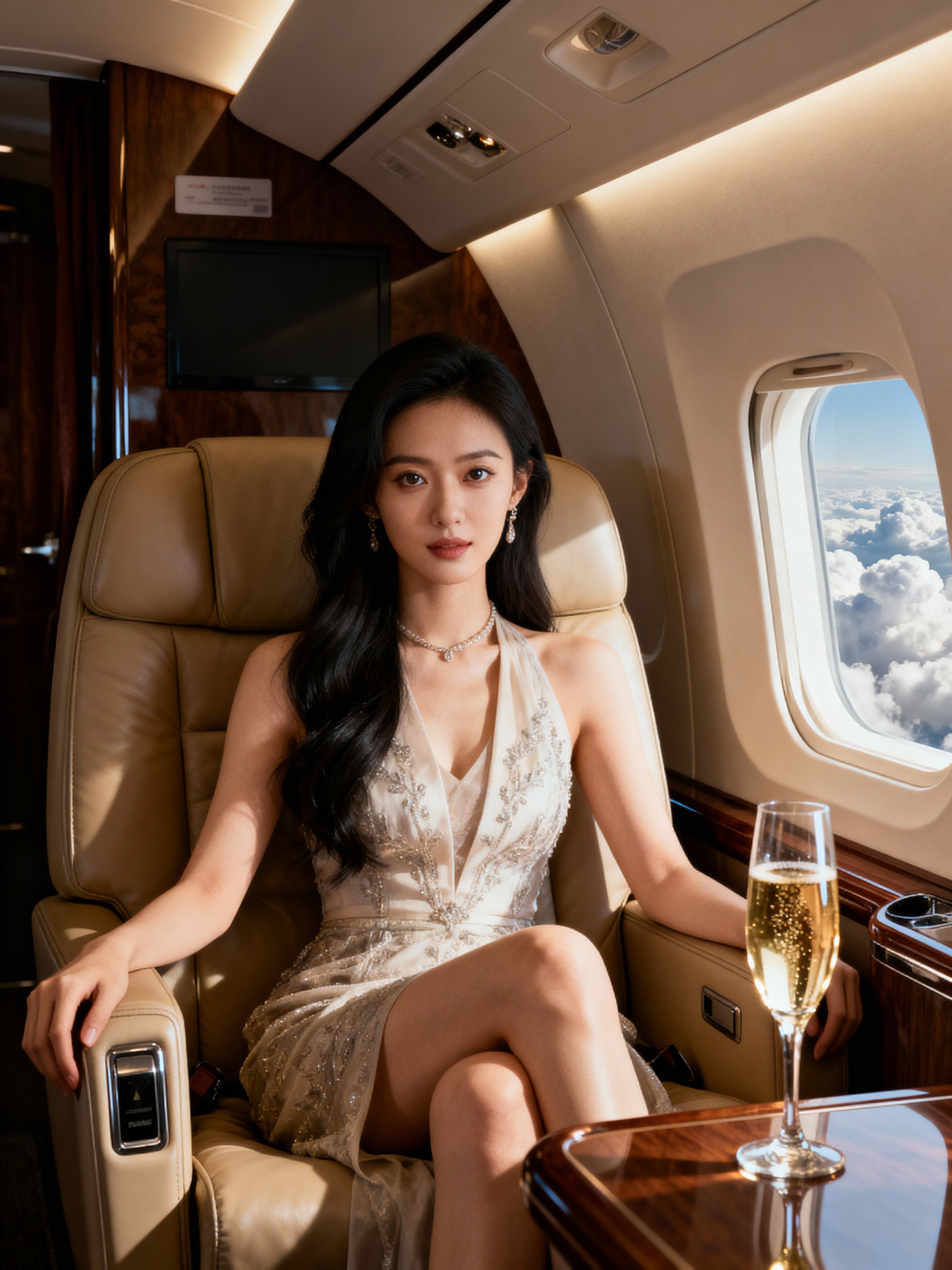 beautiful influencer instagram model wearing elegant clothes sitting in private jet cabin, with leather interior, luxurious. champagne is on the table. outside is clouds because we are flying.