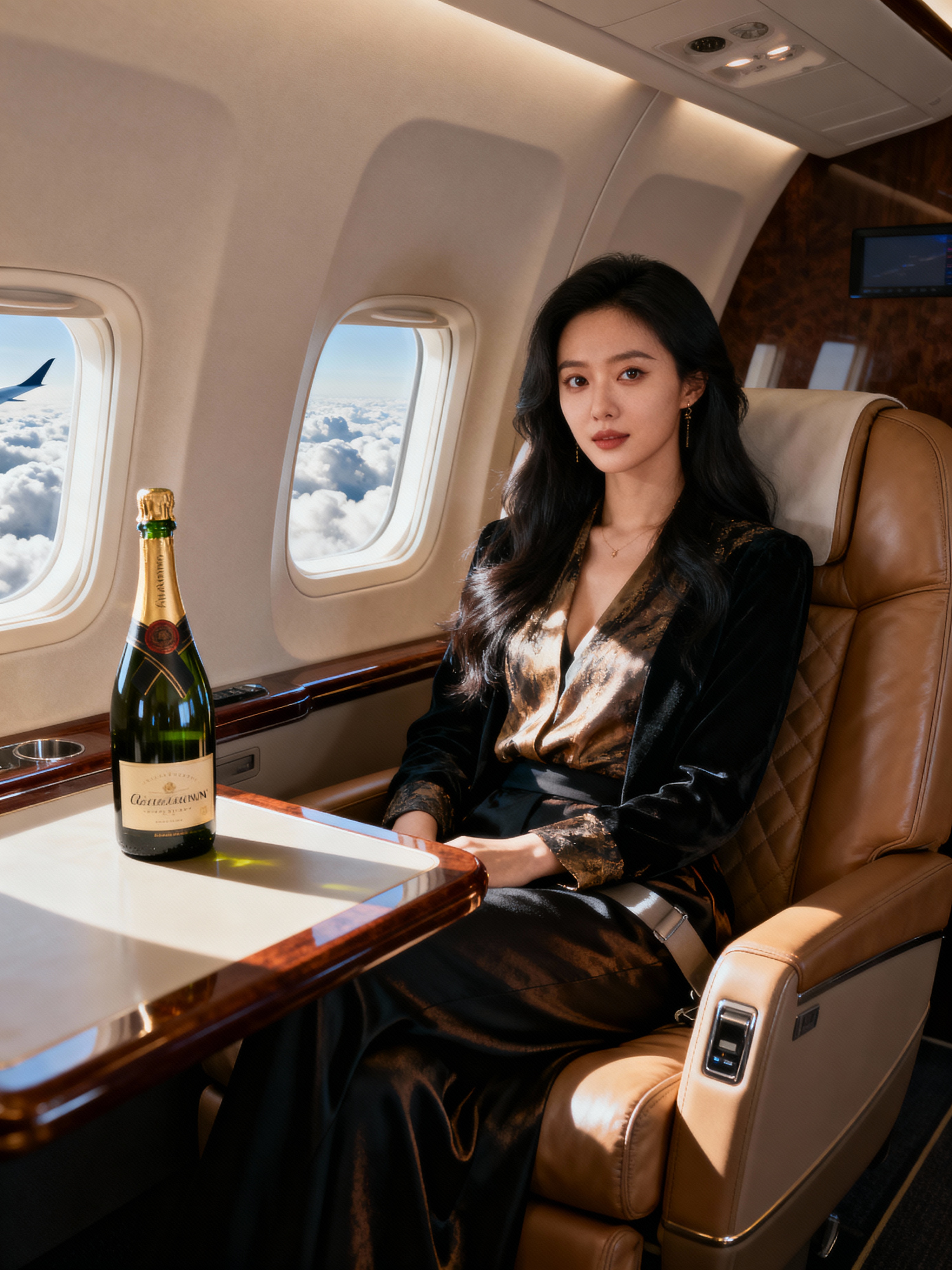 beautiful influencer instagram model wearing elegant clothes sitting in private jet cabin, with leather interior, luxurious. champagne is on the table. outside is clouds because we are flying.