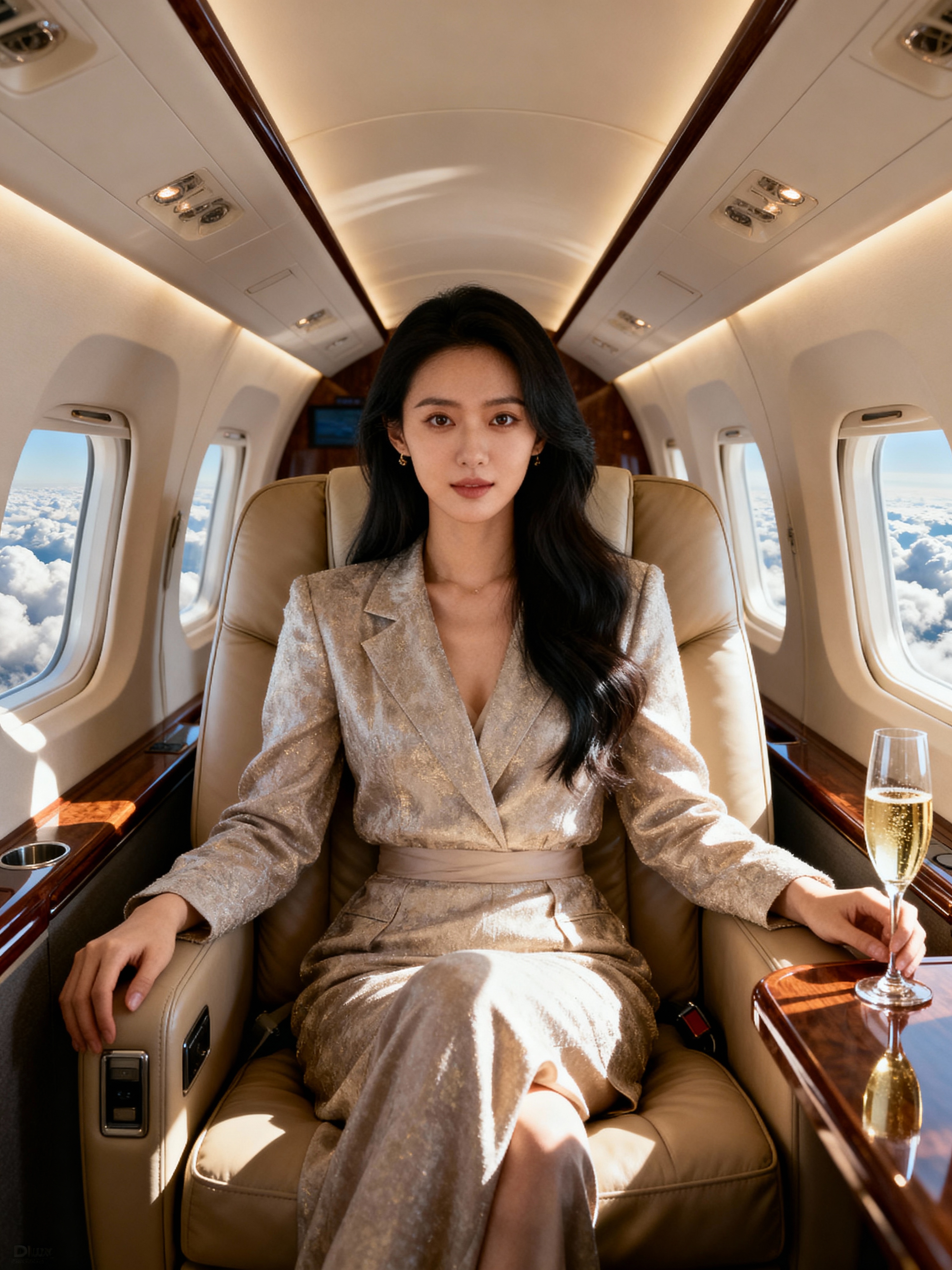 beautiful influencer instagram model wearing elegant clothes sitting in private jet cabin, with leather interior, luxurious. champagne is on the table. outside is clouds because we are flying.
