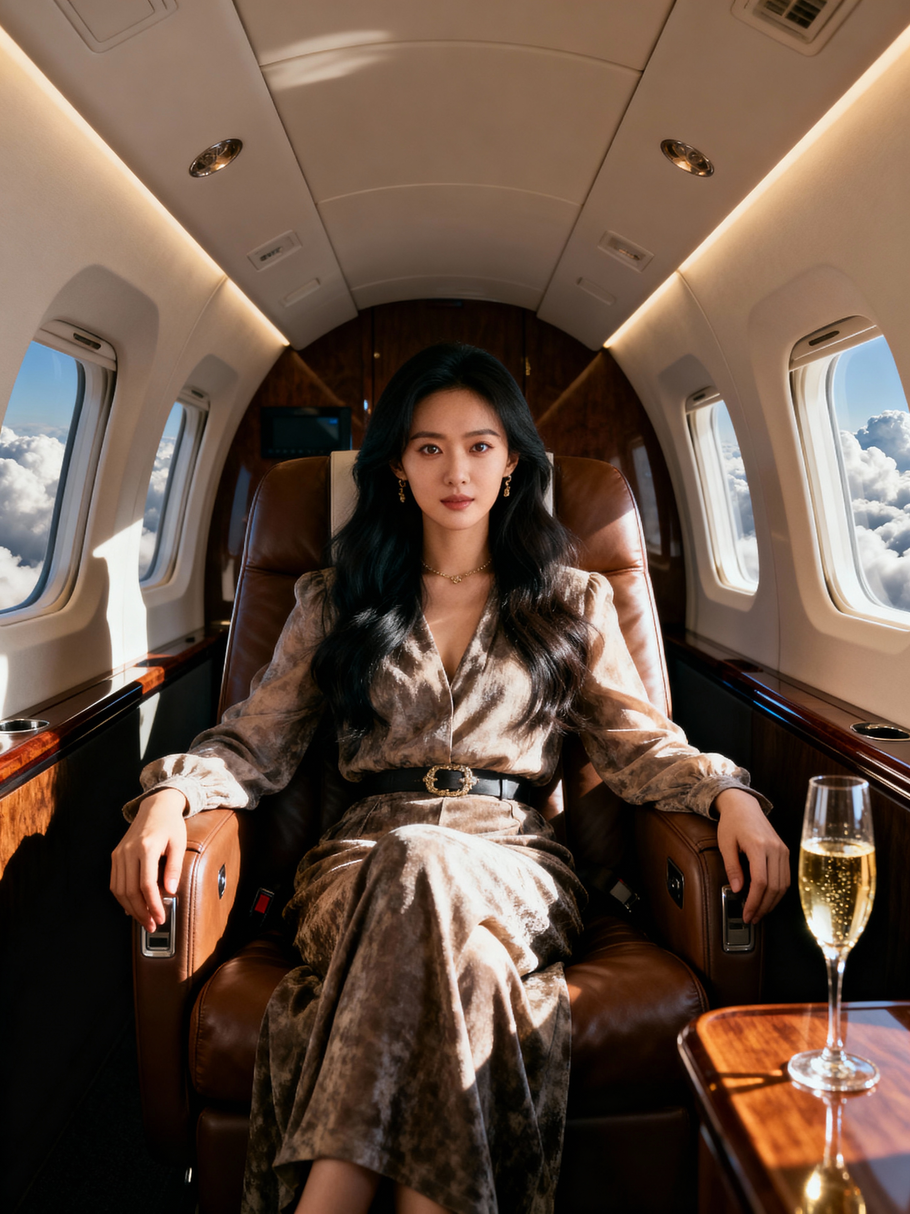 beautiful influencer instagram model wearing elegant clothes sitting in private jet cabin, with leather interior, luxurious. champagne is on the table. outside is clouds because we are flying.