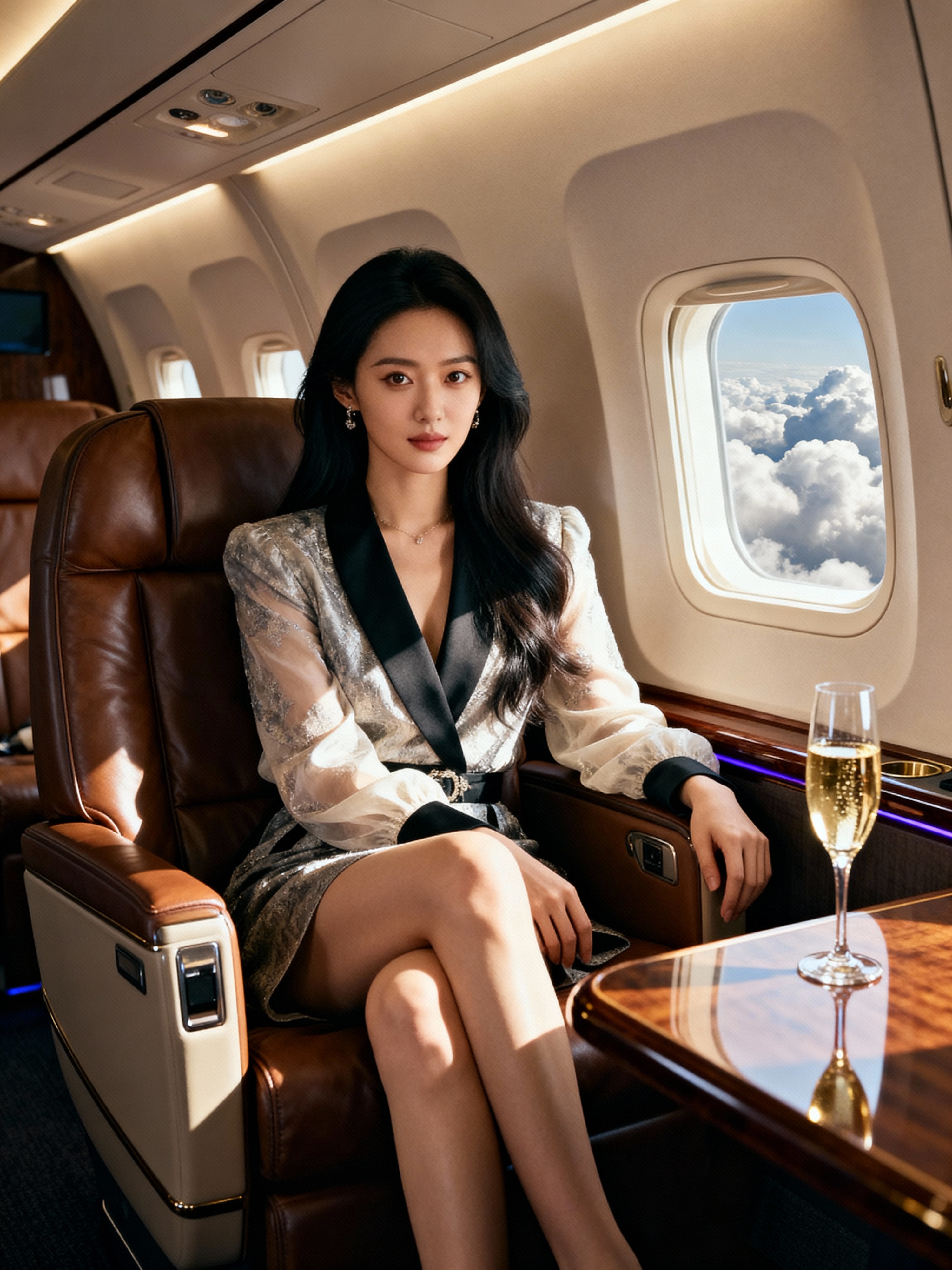 beautiful influencer instagram model wearing elegant clothes sitting in private jet cabin, with leather interior, luxurious. champagne is on the table. outside is clouds because we are flying.