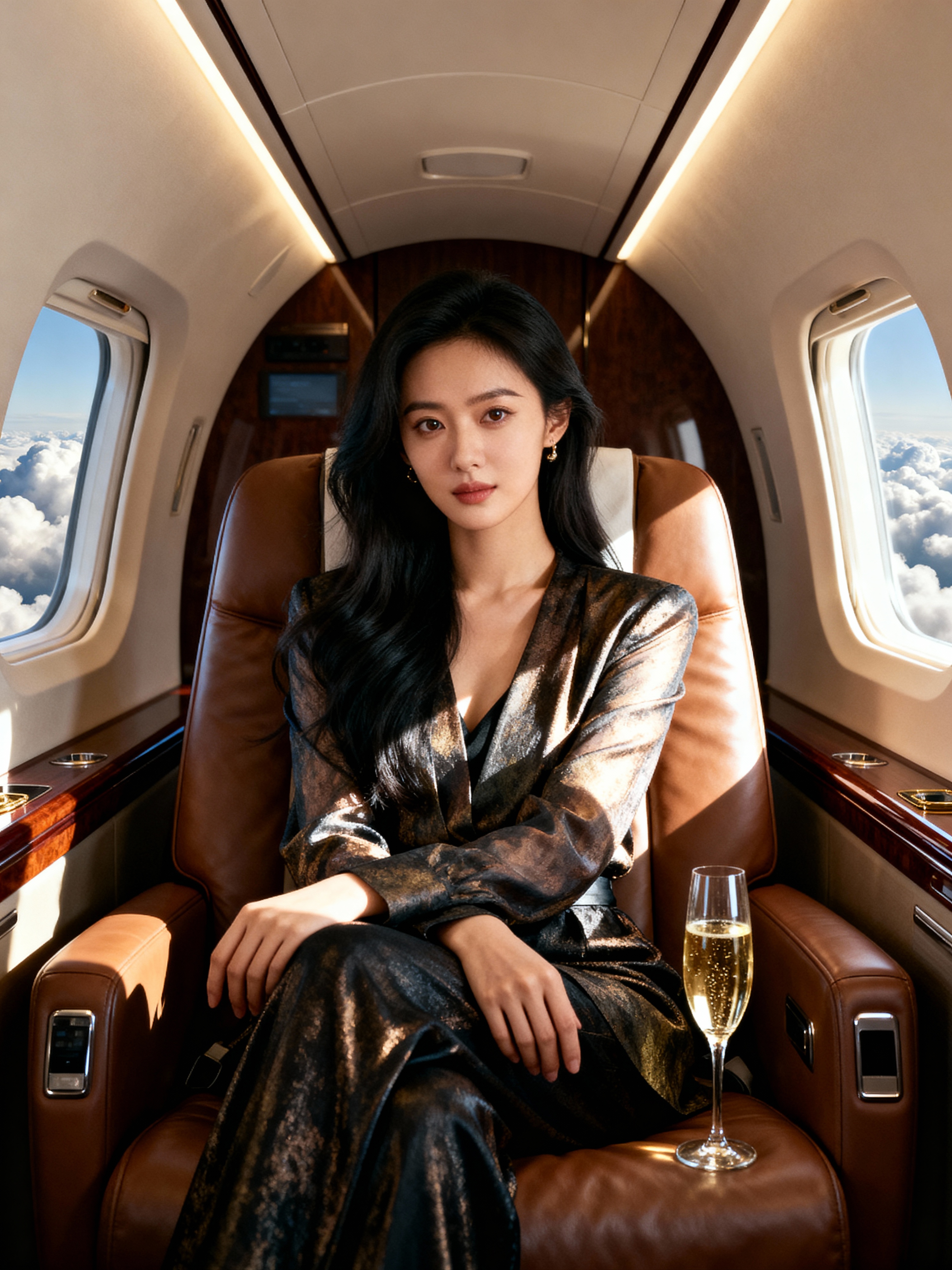beautiful influencer instagram model wearing elegant clothes sitting in private jet cabin, with leather interior, luxurious. champagne is on the table. outside is clouds because we are flying.