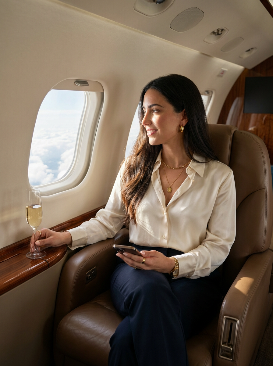 beautiful influencer instagram model wearing elegant clothes sitting in private jet cabin, with leather interior, luxurious. champagne is on the table. outside is clouds because we are flying.