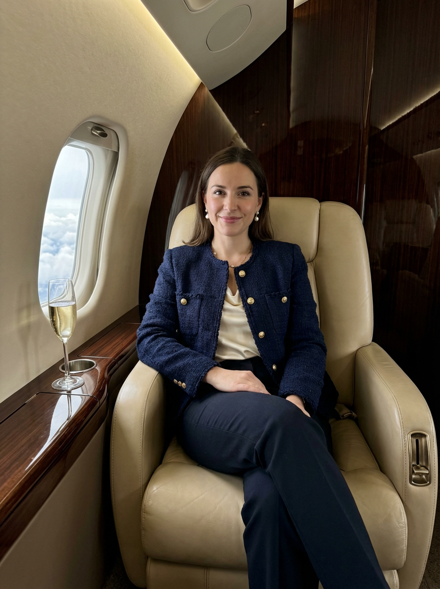 beautiful influencer instagram model wearing elegant clothes sitting in private jet cabin, with leather interior, luxurious. champagne is on the table. outside is clouds because we are flying.
