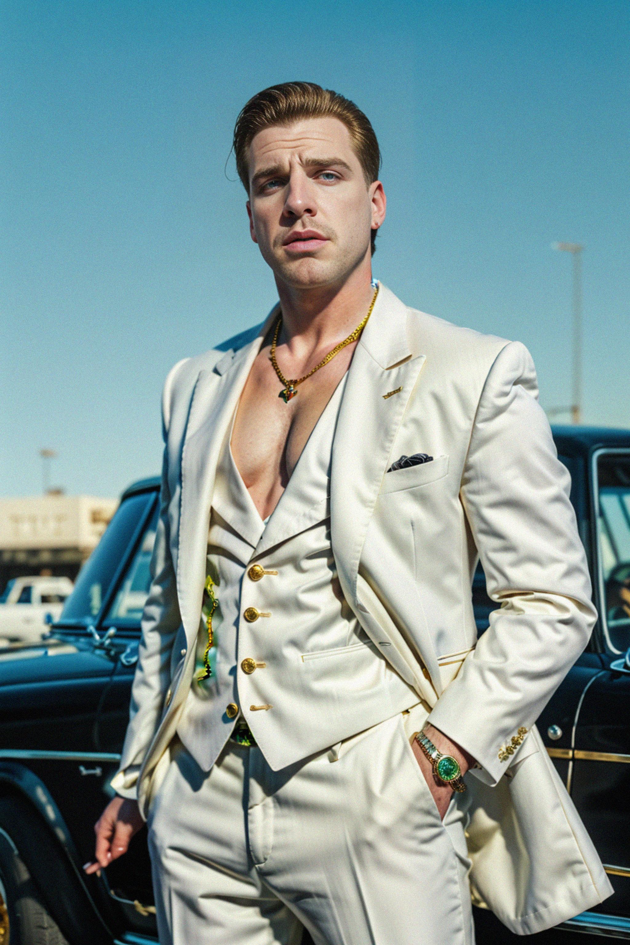 beautiful model as a mobster, mafia, mafia outfit, tailored suits, chunky gold jewelry, mafia aesthetic, flashy, glamorous, luxury, loud, Goodfellas, The Sopranos, Mob Wives, opulence, confidence
