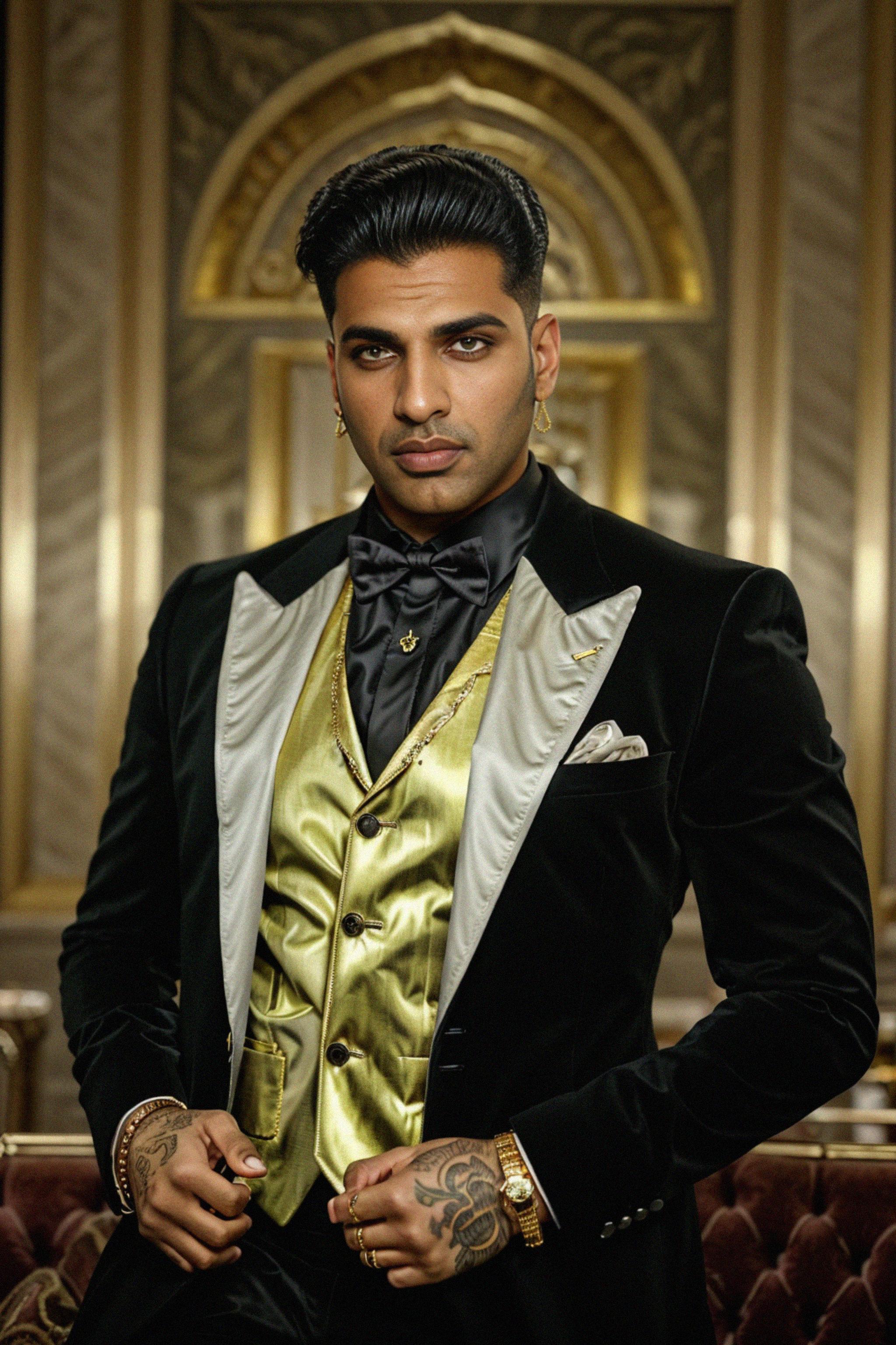 beautiful model as a mobster, mafia, mafia outfit, tailored suits, chunky gold jewelry, mafia aesthetic, flashy, glamorous, luxury, loud, Goodfellas, The Sopranos, Mob Wives, opulence, confidence