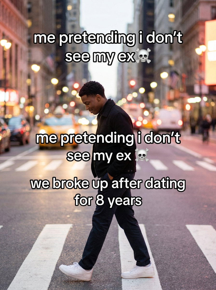 beautiful model with shy expression walking in New York, cinematic lighting, overlay TikTok-style text captions in bold white text with black outline "me pretending i don't see my ex ☠️" and smaller text below (we broke up after dating for 8 years)