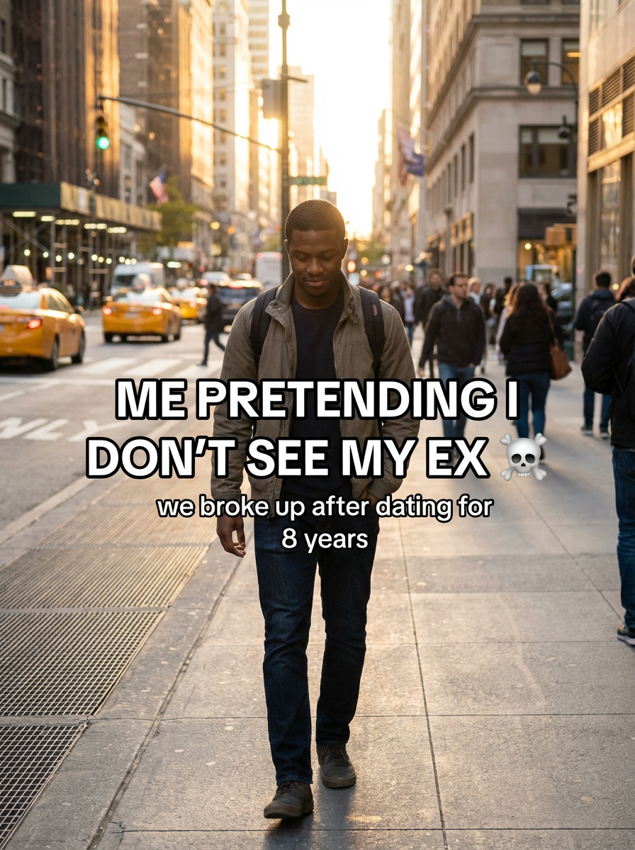 beautiful model with shy expression walking in New York, cinematic lighting, overlay TikTok-style text captions in bold white text with black outline "me pretending i don't see my ex ☠️" and smaller text below (we broke up after dating for 8 years)
