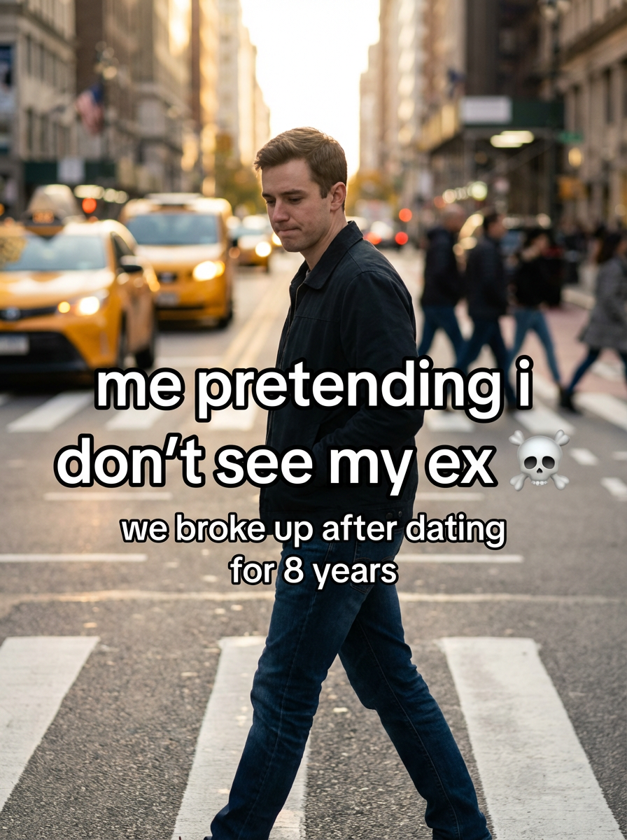 beautiful model with shy expression walking in New York, cinematic lighting, overlay TikTok-style text captions in bold white text with black outline "me pretending i don't see my ex ☠️" and smaller text below (we broke up after dating for 8 years)