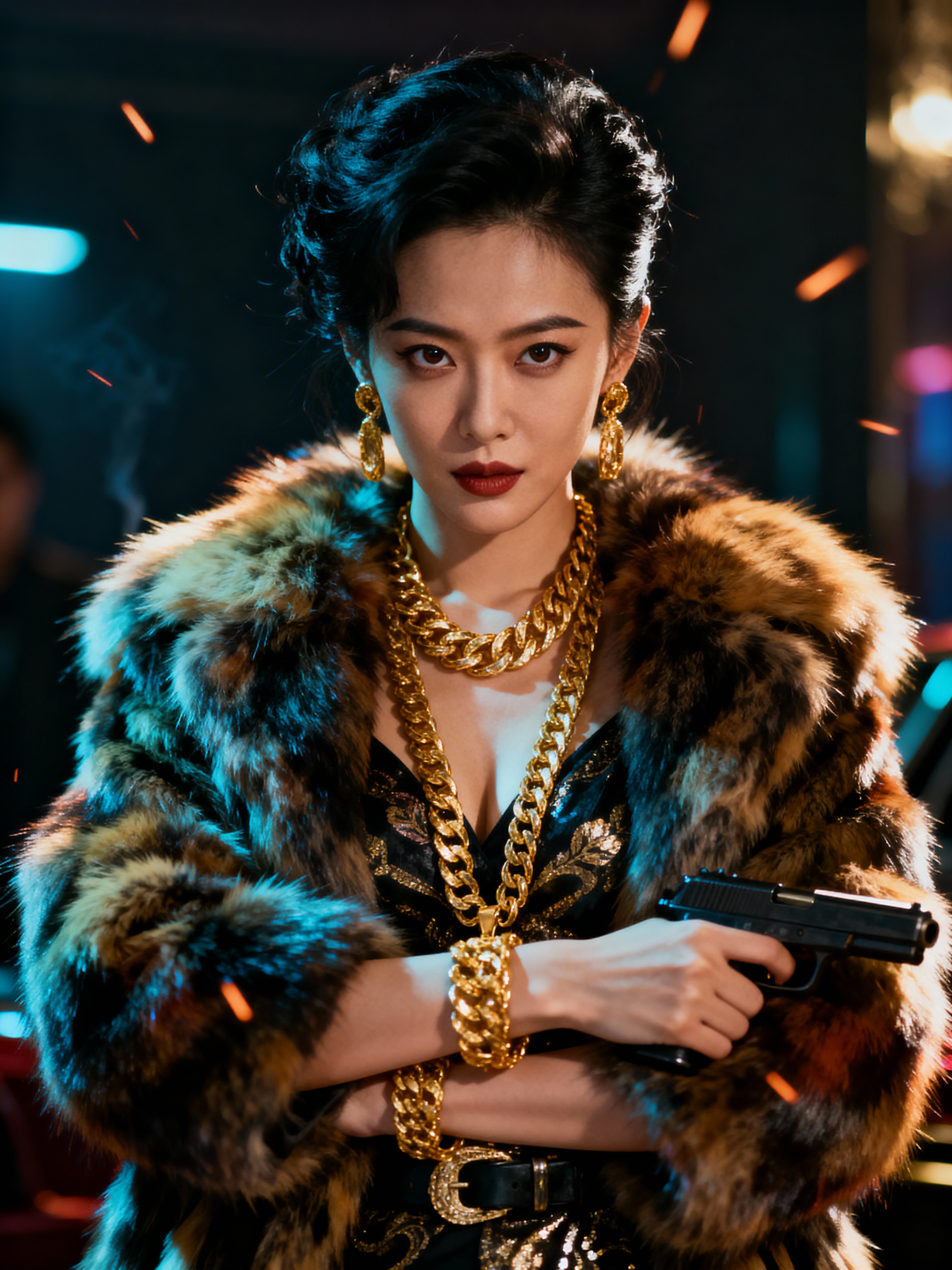 beautiful model as a mobster, mafia, mafia outfit, faux fur coats, chunky gold jewelry, mafia aesthetic, flashy, glamorous, luxury, loud, Goodfellas, The Sopranos, Mob Wives, opulence, confidence
