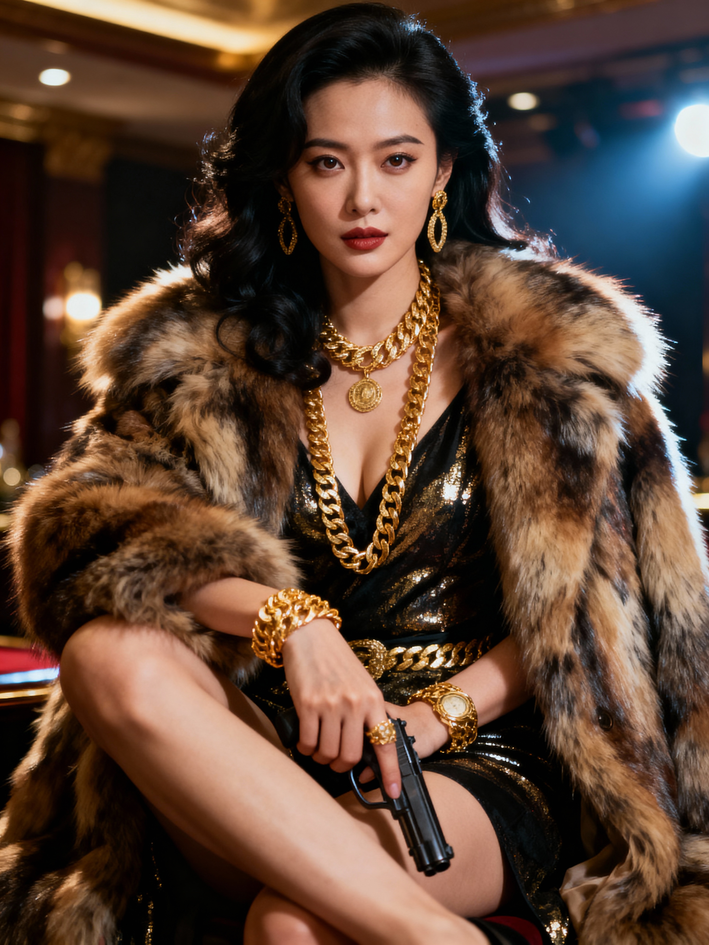 beautiful model as a mobster, mafia, mafia outfit, faux fur coats, chunky gold jewelry, mafia aesthetic, flashy, glamorous, luxury, loud, Goodfellas, The Sopranos, Mob Wives, opulence, confidence