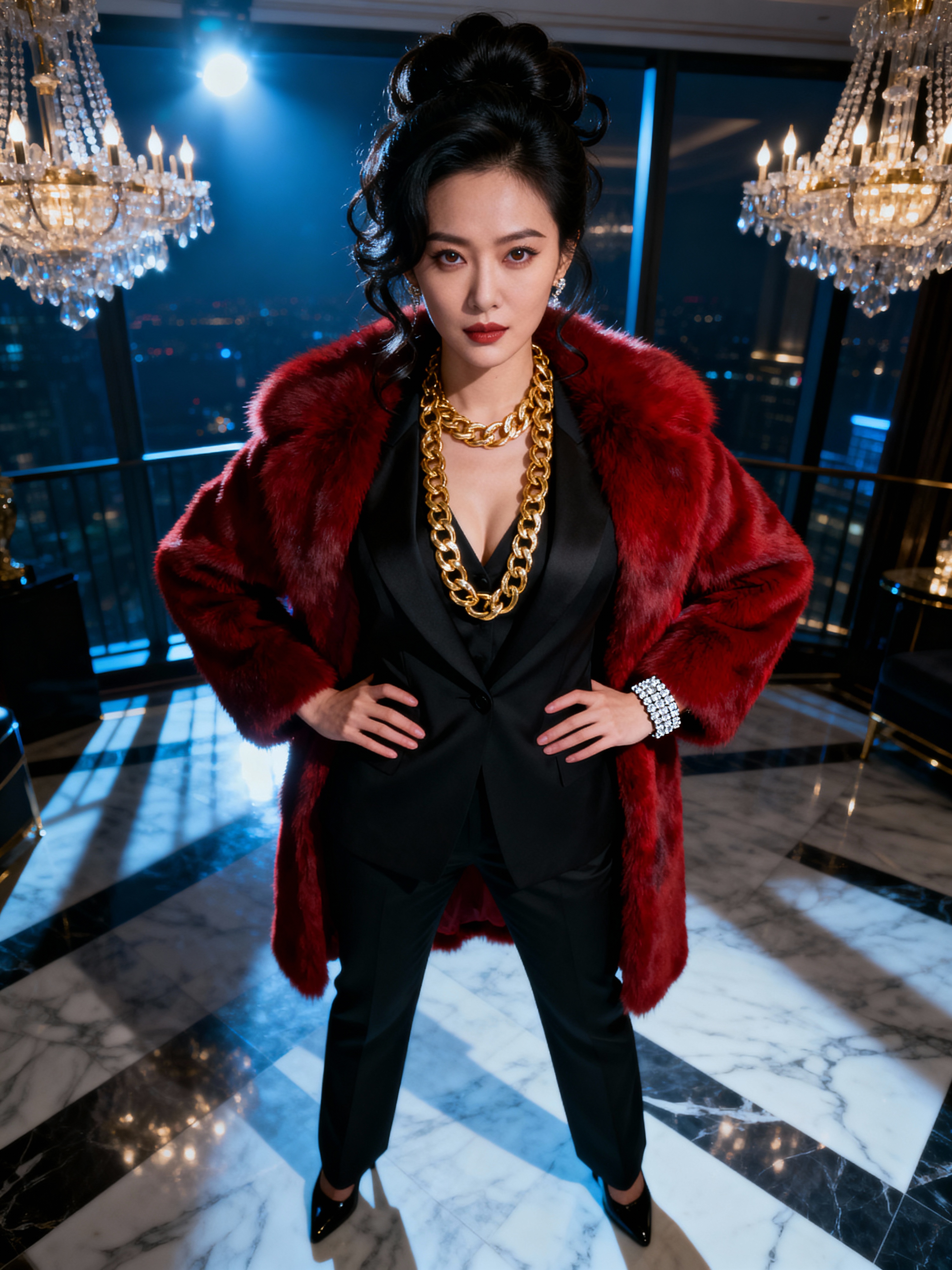 beautiful model as a mobster, mafia, mafia outfit, faux fur coats, chunky gold jewelry, mafia aesthetic, flashy, glamorous, luxury, loud, Goodfellas, The Sopranos, Mob Wives, opulence, confidence