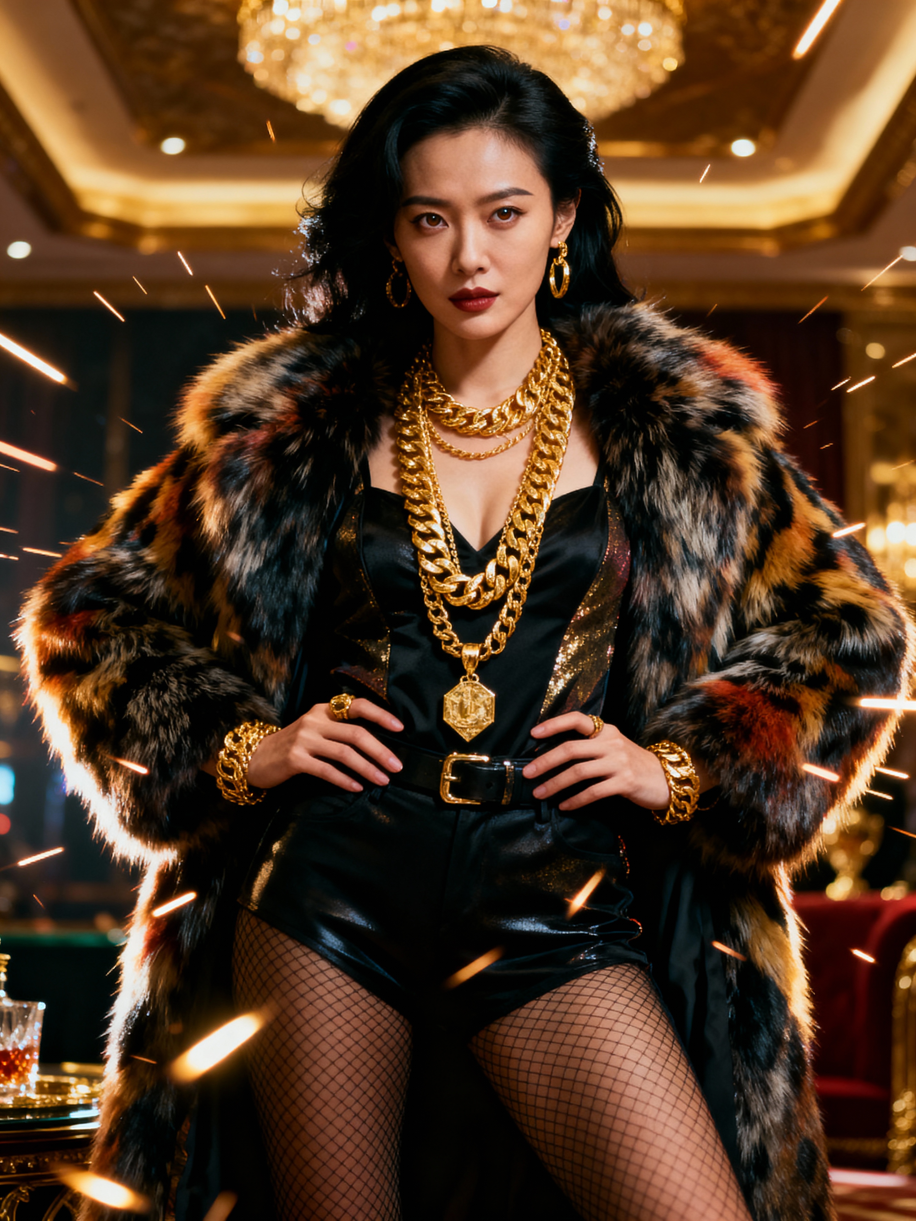 beautiful model as a mobster, mafia, mafia outfit, faux fur coats, chunky gold jewelry, mafia aesthetic, flashy, glamorous, luxury, loud, Goodfellas, The Sopranos, Mob Wives, opulence, confidence