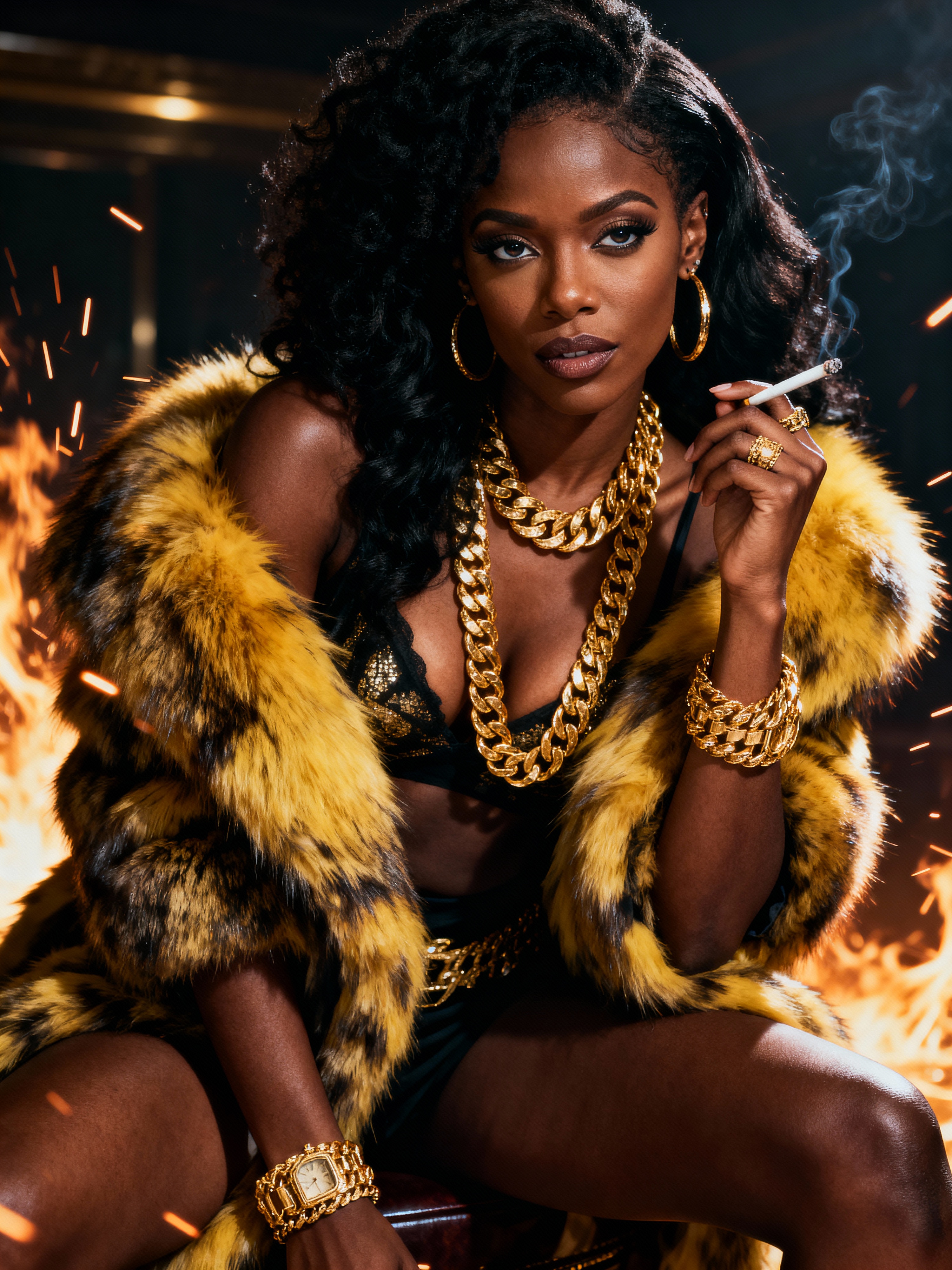 beautiful model as a mobster, mafia, mafia outfit, faux fur coats, chunky gold jewelry, mafia aesthetic, flashy, glamorous, luxury, loud, Goodfellas, The Sopranos, Mob Wives, opulence, confidence