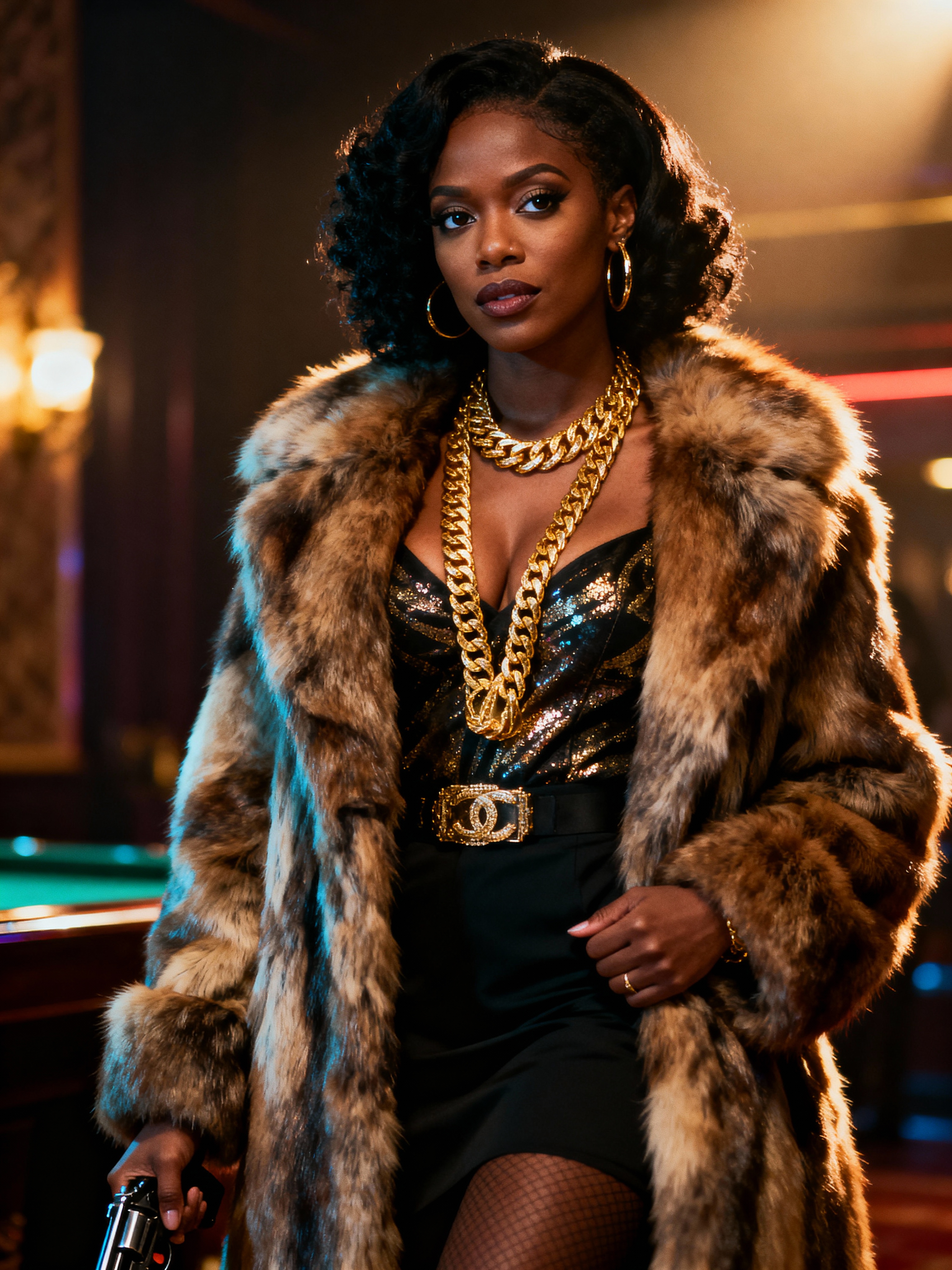 beautiful model as a mobster, mafia, mafia outfit, faux fur coats, chunky gold jewelry, mafia aesthetic, flashy, glamorous, luxury, loud, Goodfellas, The Sopranos, Mob Wives, opulence, confidence