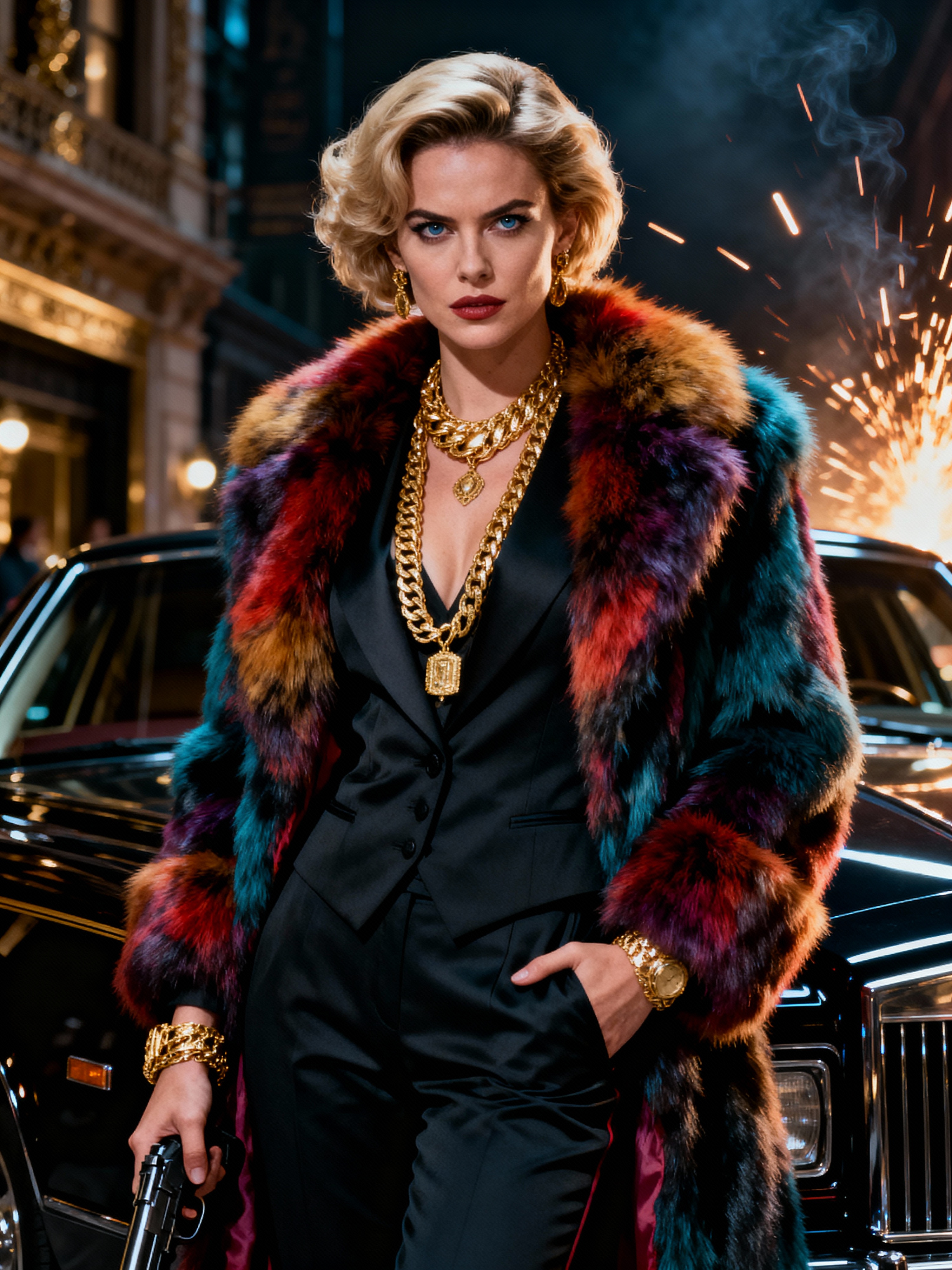 beautiful model as a mobster, mafia, mafia outfit, faux fur coats, chunky gold jewelry, mafia aesthetic, flashy, glamorous, luxury, loud, Goodfellas, The Sopranos, Mob Wives, opulence, confidence