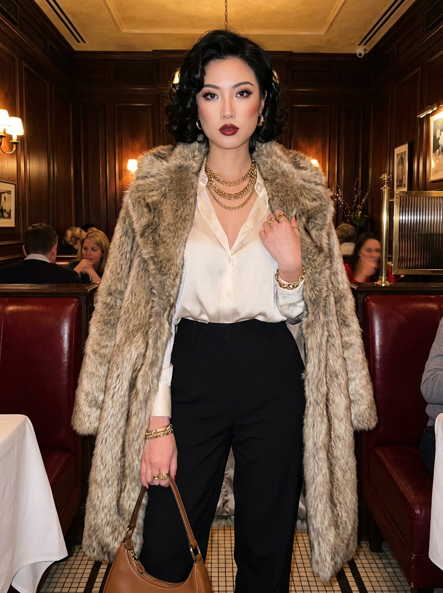 beautiful model as a mobster, mafia, mafia outfit, faux fur coats, chunky gold jewelry, mafia aesthetic, flashy, glamorous, luxury, loud, Goodfellas, The Sopranos, Mob Wives, opulence, confidence