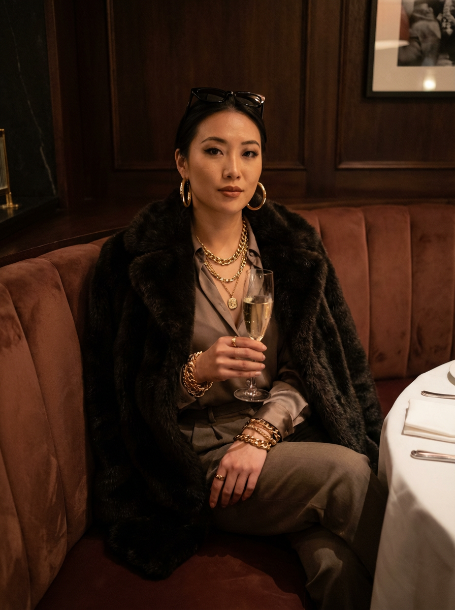 beautiful model as a mobster, mafia, mafia outfit, faux fur coats, chunky gold jewelry, mafia aesthetic, flashy, glamorous, luxury, loud, Goodfellas, The Sopranos, Mob Wives, opulence, confidence